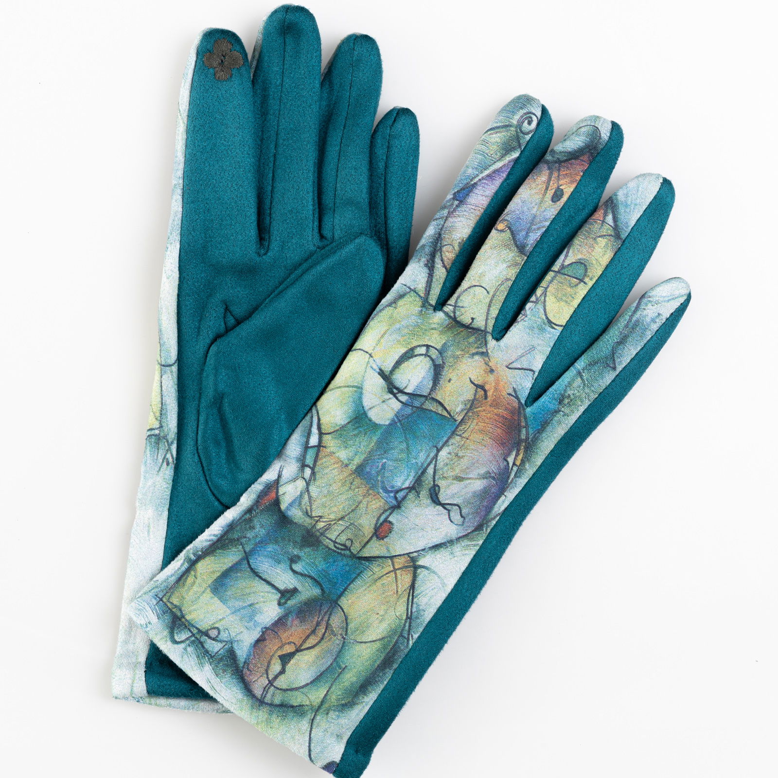 Manusi dama imprimeu pictural abstract pe fond turcoaz, material catifelat