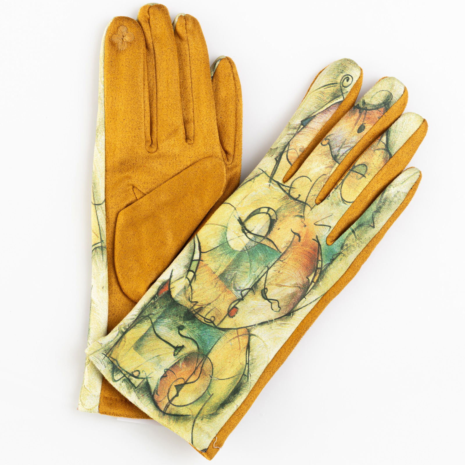 Manusi dama imprimeu pictural abstract pe fond galben mustar, material catifelat