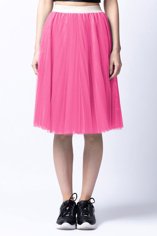• Fusta este confectionata din material vaporos astfel incat in orice tinuta vei alege sa o porti, te va ajuta sa te simti ca o printesa. Talia este reglabila pe baza elaticului tesut din fir auriu, ce ii adauga o nota de feminitate.