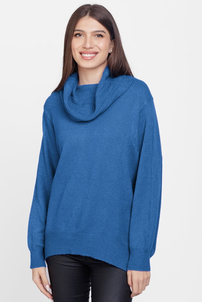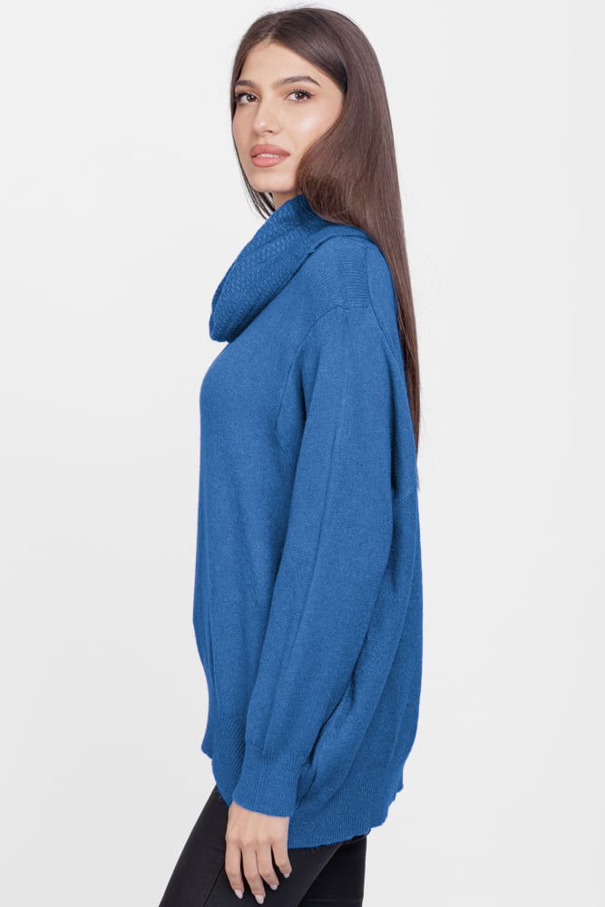 Pulover cu guler inalt elegant, din vascoza si lana, albastru