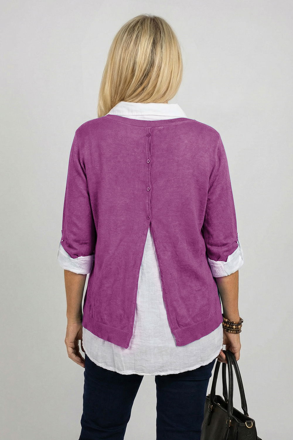Shopika Bluza si camasa trei in unu, cu tricot fin, camasa din bumbac si esarfa cu franjuri dantelati, mov