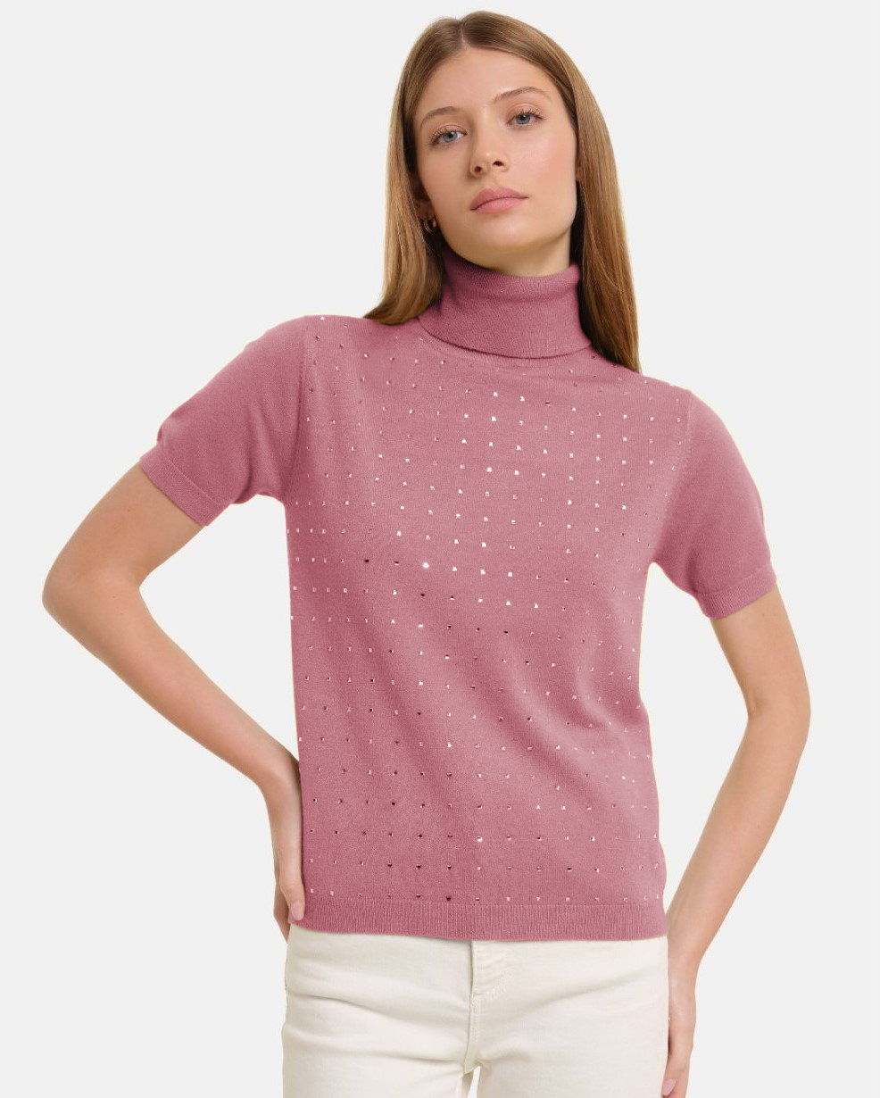Shopika Helanca, pulover cu strasuri cu guler inalt si maneca scurta, din tricotaj fin, roz inchis