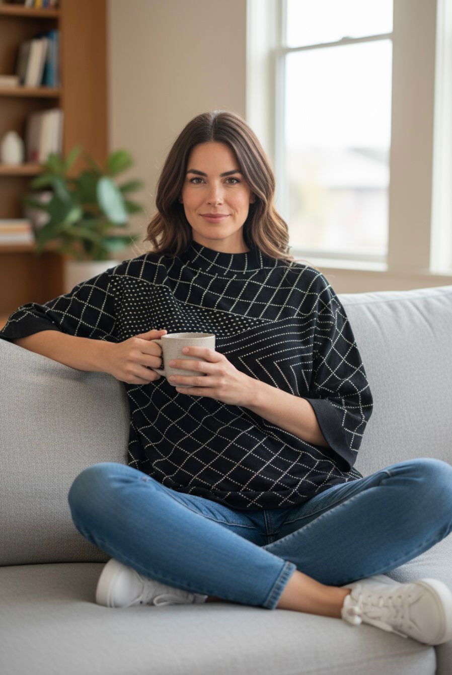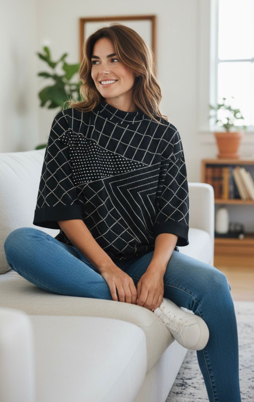 Shopika Pulover cu jocuri de linii albe pe fond negru