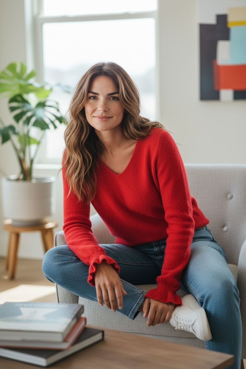 Shopika Pulover pufos cu alpaca, volane la maneci si decolteu in V – model casual chic, rosu