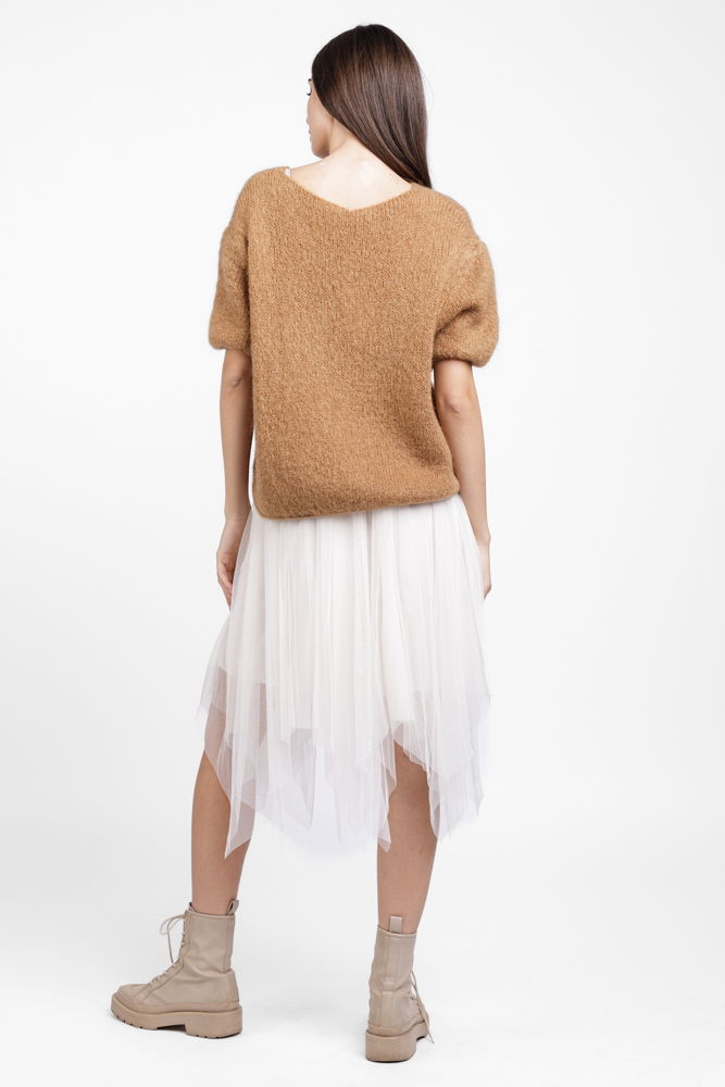 Shopika Pulover pufos cu maneca scurta, cu mohair si lana, camel