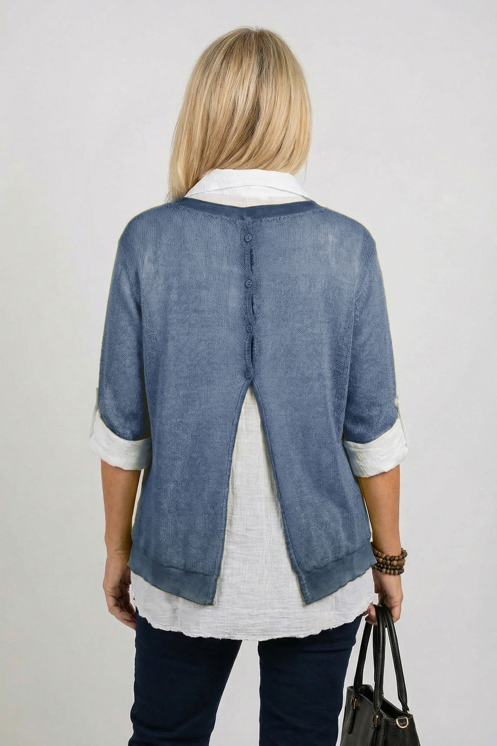 Un top 3 in 1 versatil care combină natural o camasa lejera, un pulover fin si o esarfa decorativa intr-o singura piesa cu impact vizual. Designul in nuanta potrivita lumineaza tinuta, iar esarfa cu detalii brodate creeaza un efect sofisticat, fara efort. Mansetele intoarse si tivul asimetric adauga dinamica si modernitate, facand piesa ideala pentru tinute casual-elegante, office relaxat sau iesiri de zi. Confortabila, aerata si extrem de flatanta, aceasta bluza este alegerea perfecta pentru femeile care apreciaza piesele smart layering gata construite.