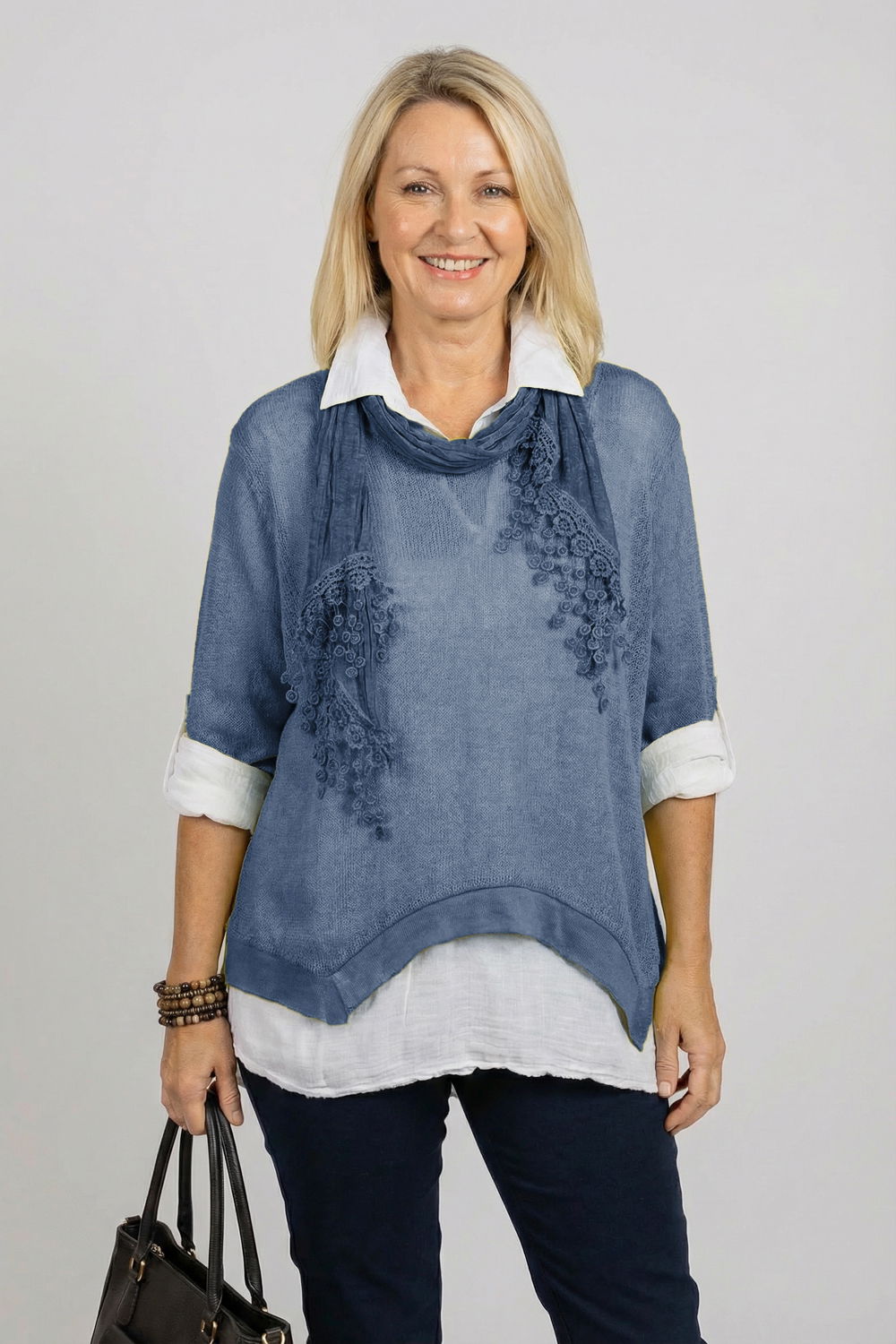 Shopika Pulover si camasa trei in unu, cu tricotaj lana si mohair, camasa din bumbac si esarfa cu franjuri dantelati, albastru jeans