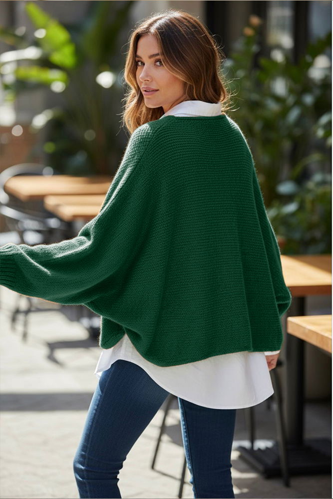 Pulover tricotat, conceput dintr-un material moale și plăcut pe piele. Croiala lejeră, tip bat-wing, oferă libertate de mișcare și un look modern, iar linia asimetrică din față creează o siluetă fluidă și stilată.
