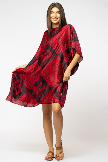 Shopika Rochie de plaja tip poncho din matase imprimat cu model geometric rosu si negru