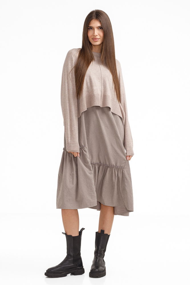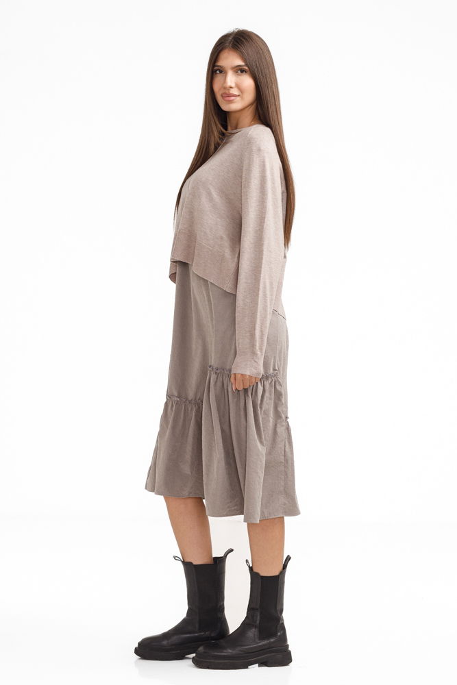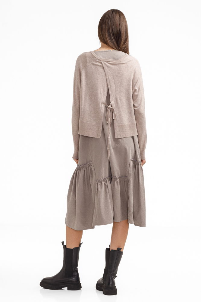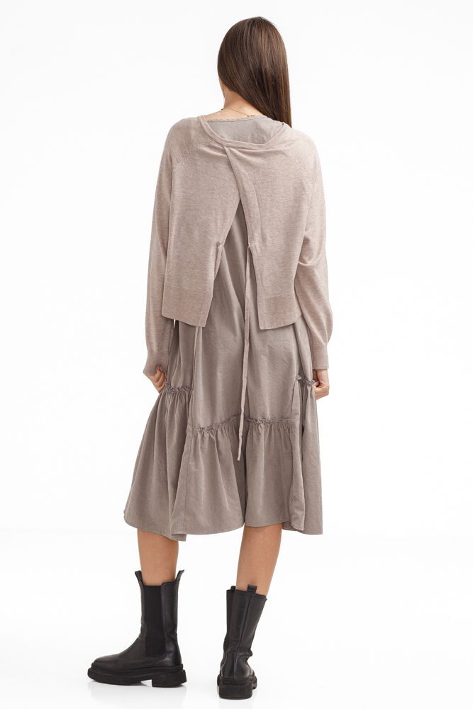 Rochie catifelata suprapusa, cu puloveras petrecut la spate, bej inchis
