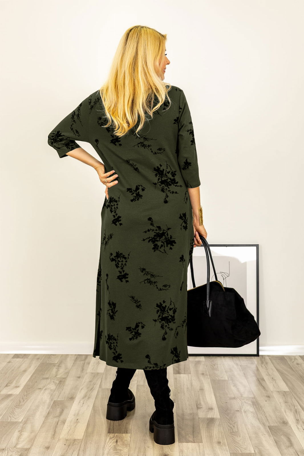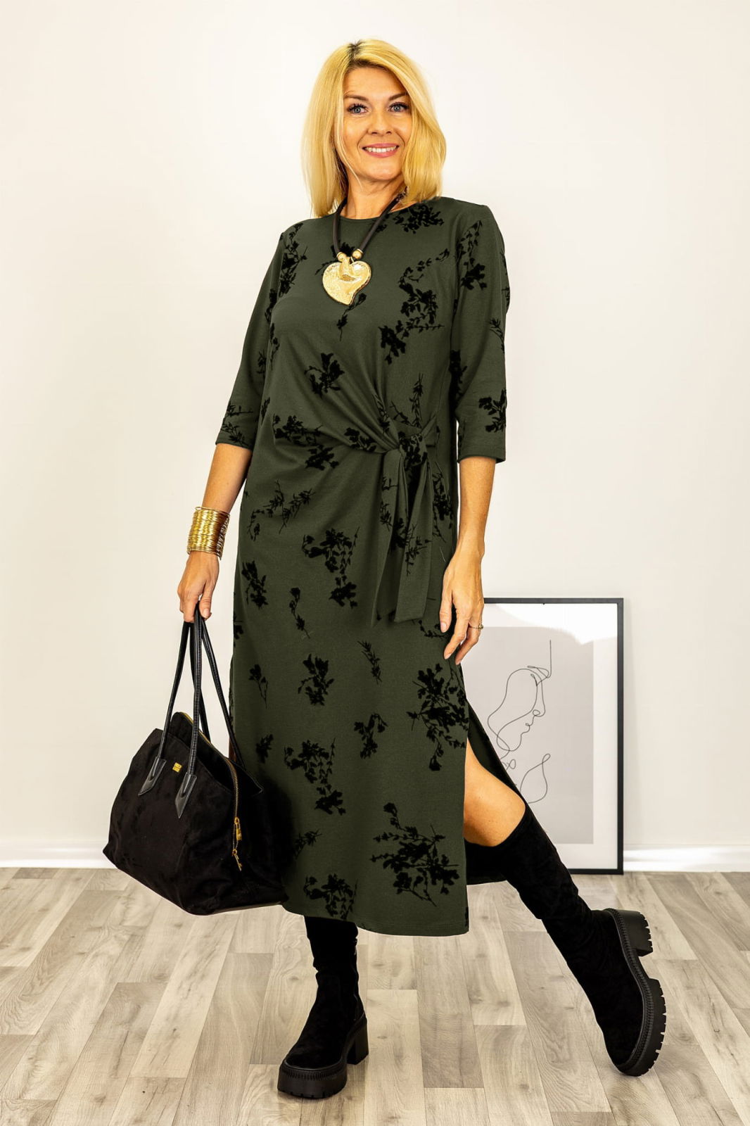 Rochie cu nod intr-o parte imprimata cu flori embosate si catifelate, din jerseu de bumbac kaki