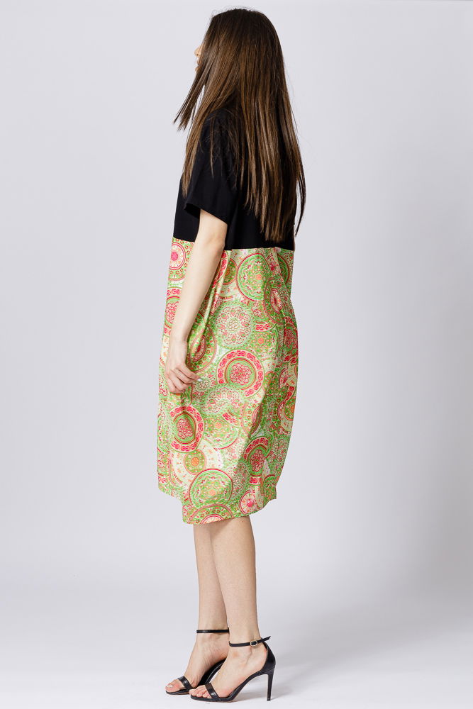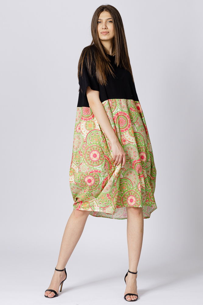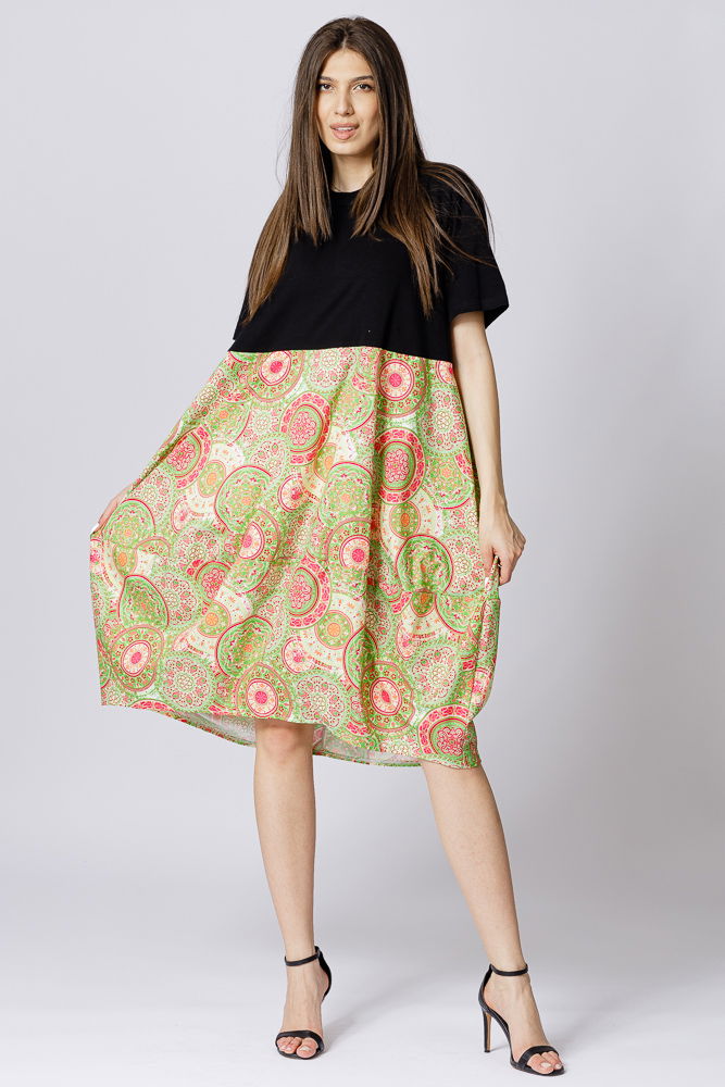 Rochie lalea cu bust negru si imprimeu mandale verde deschis