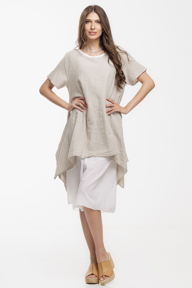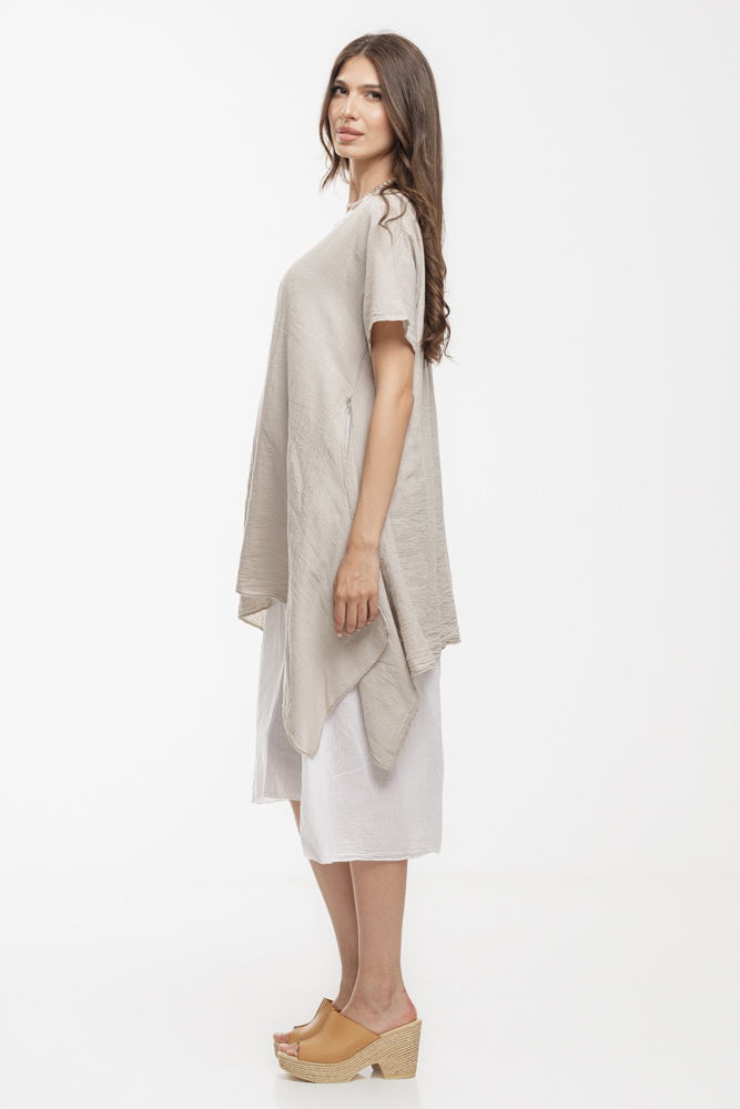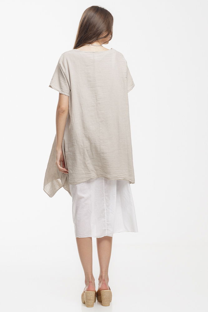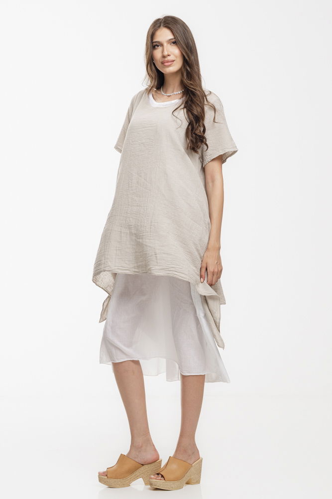 Rochie vaporoasa de vara, realizata integral din bumbac natural, ideala pentru zilele calduroase. Designul in doua straturi ofera un efect elegant si aerisit: stratul superior are o croiala lejera si asimetrica, iar stratul interior este usor si fluid. Perfecta pentru vacanta, plimbari sau tinute casual-chic cu stil si confort.