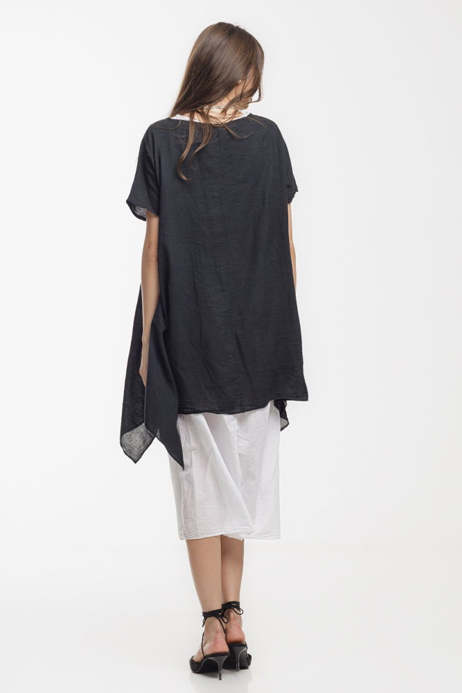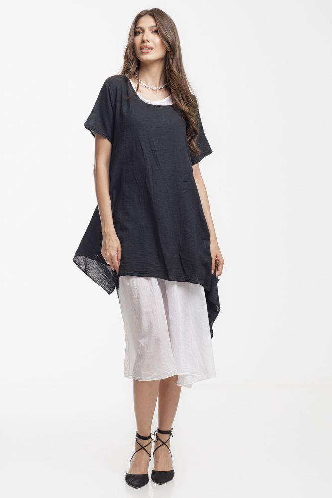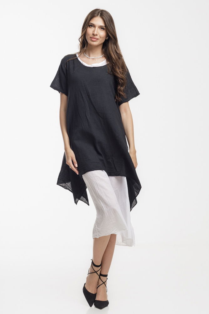 Rochie vaporoasa de vara, realizata integral din bumbac natural, ideala pentru zilele calduroase. Designul in doua straturi ofera un efect elegant si aerisit: stratul superior are o croiala lejera si asimetrica, iar stratul interior este usor si fluid. Perfecta pentru vacanta, plimbari sau tinute casual-chic cu stil si confort.
