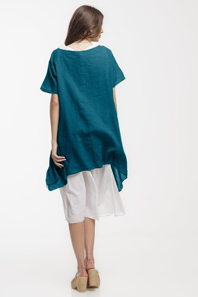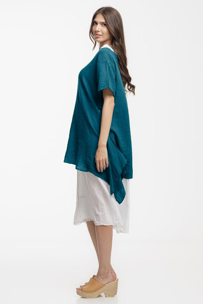 Shopika Rochie lejera din bumbac cu doua straturi si croi asimetric, alb - turcoaz inchis