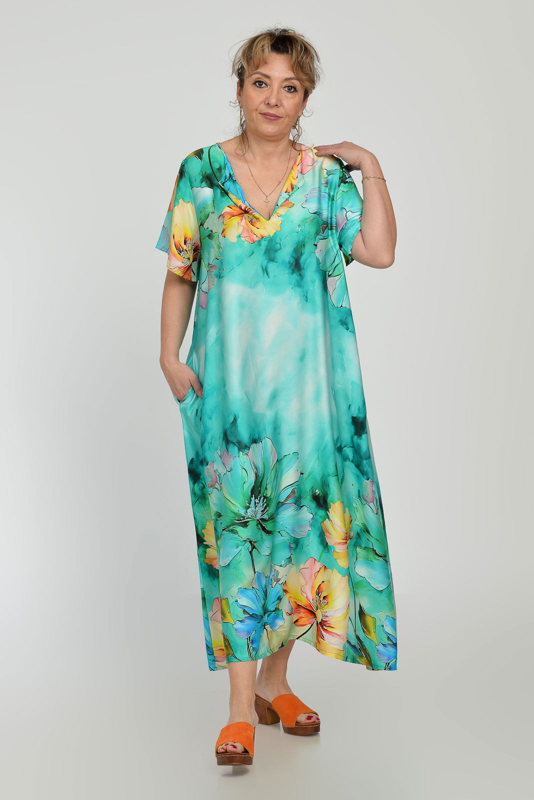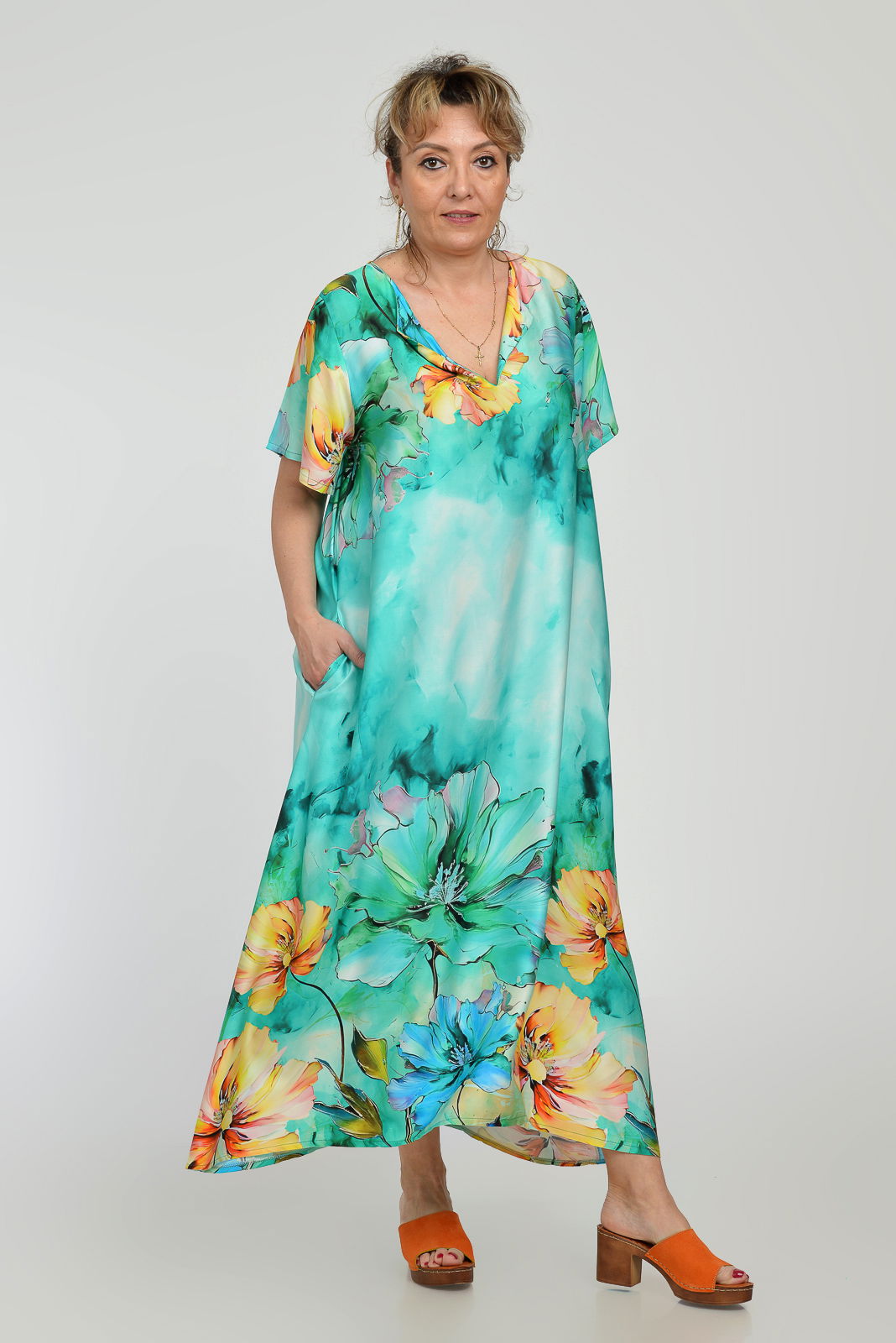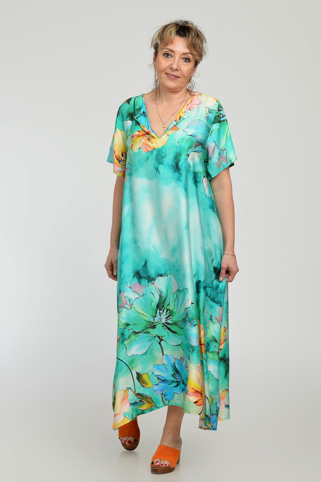 Shopika Rochie lunga A-line din vascoza cu matase, cu imprimeu floral pictural pe fond turcoaz