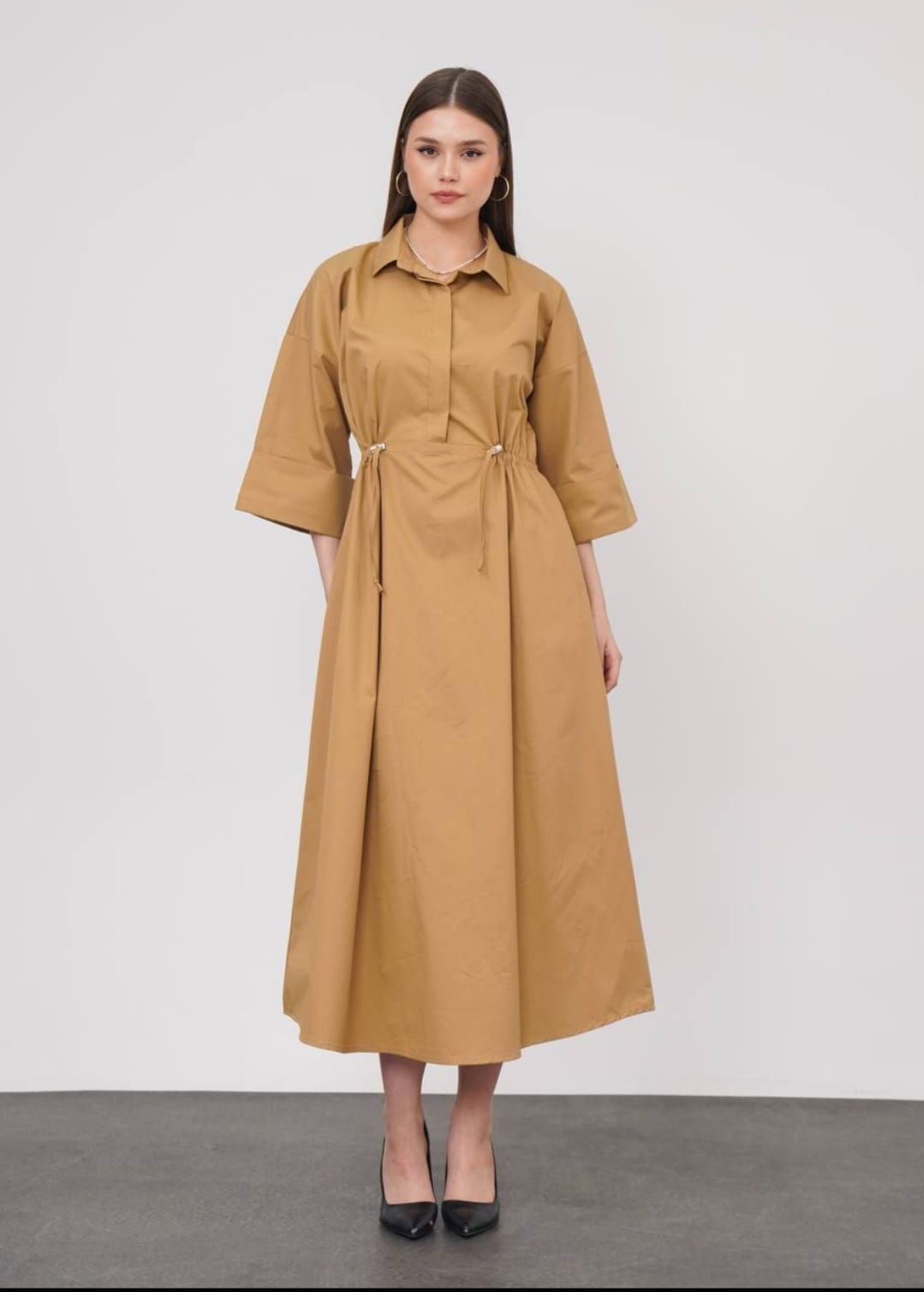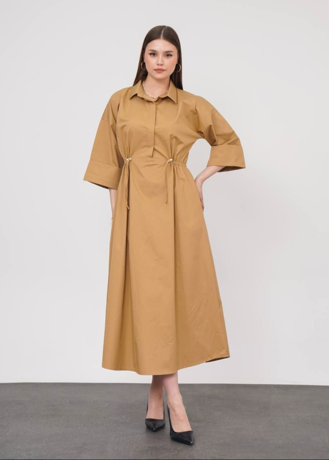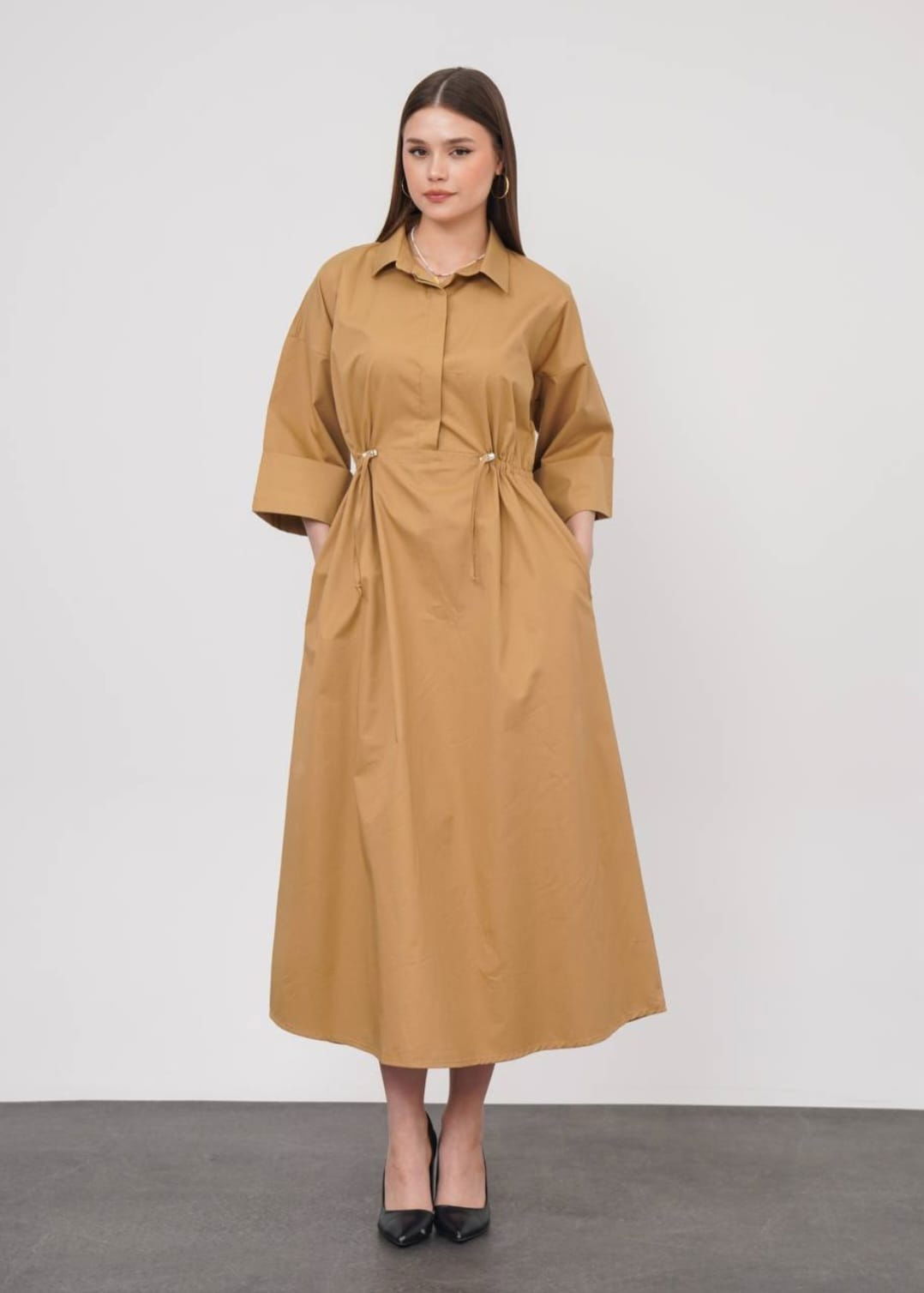 Rochie lunga tip camasa din poplin satinat de bumbac, camel