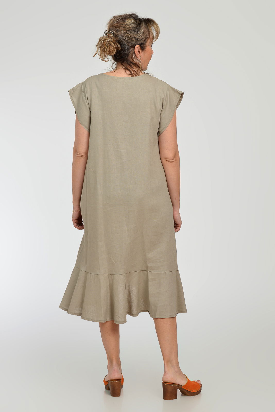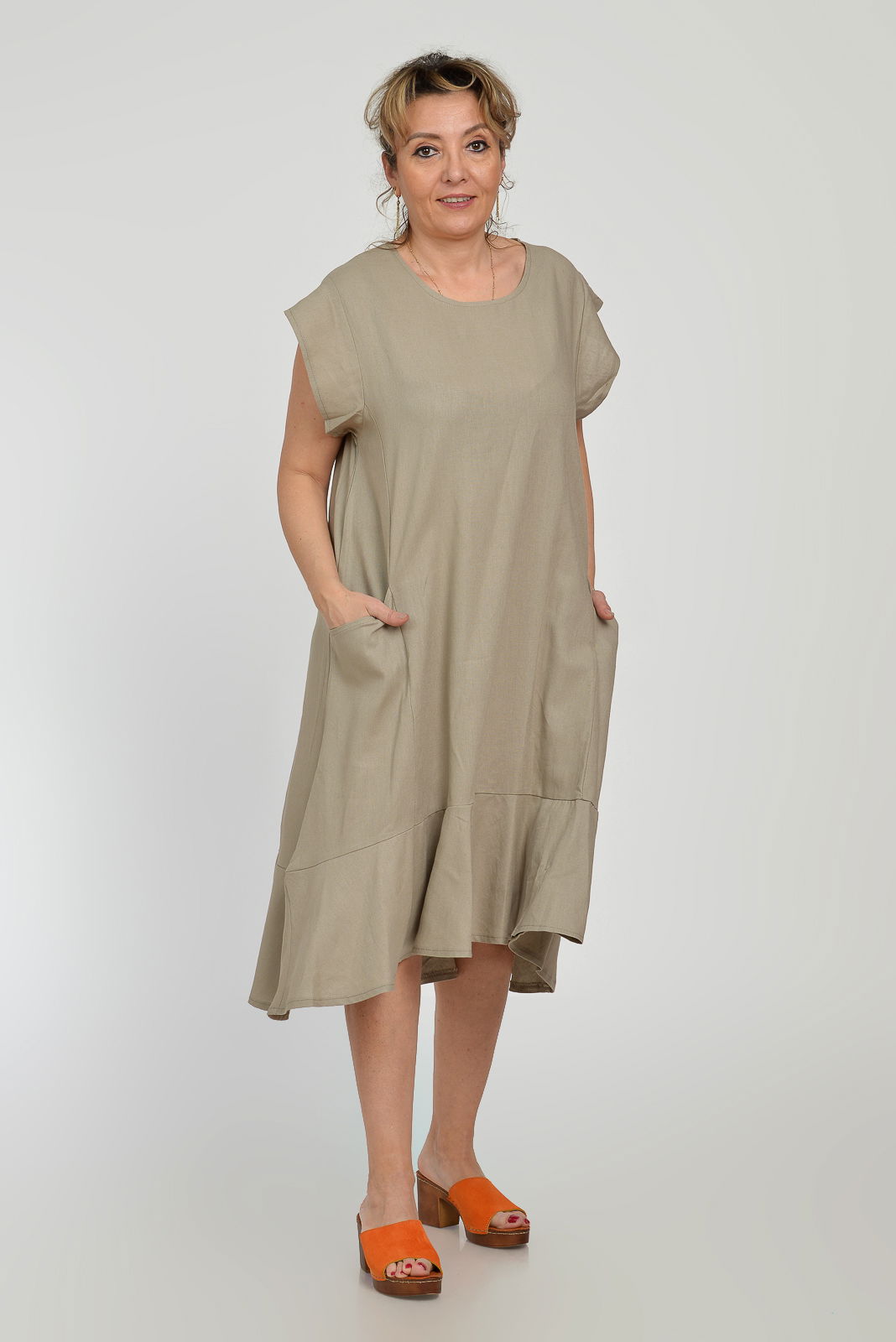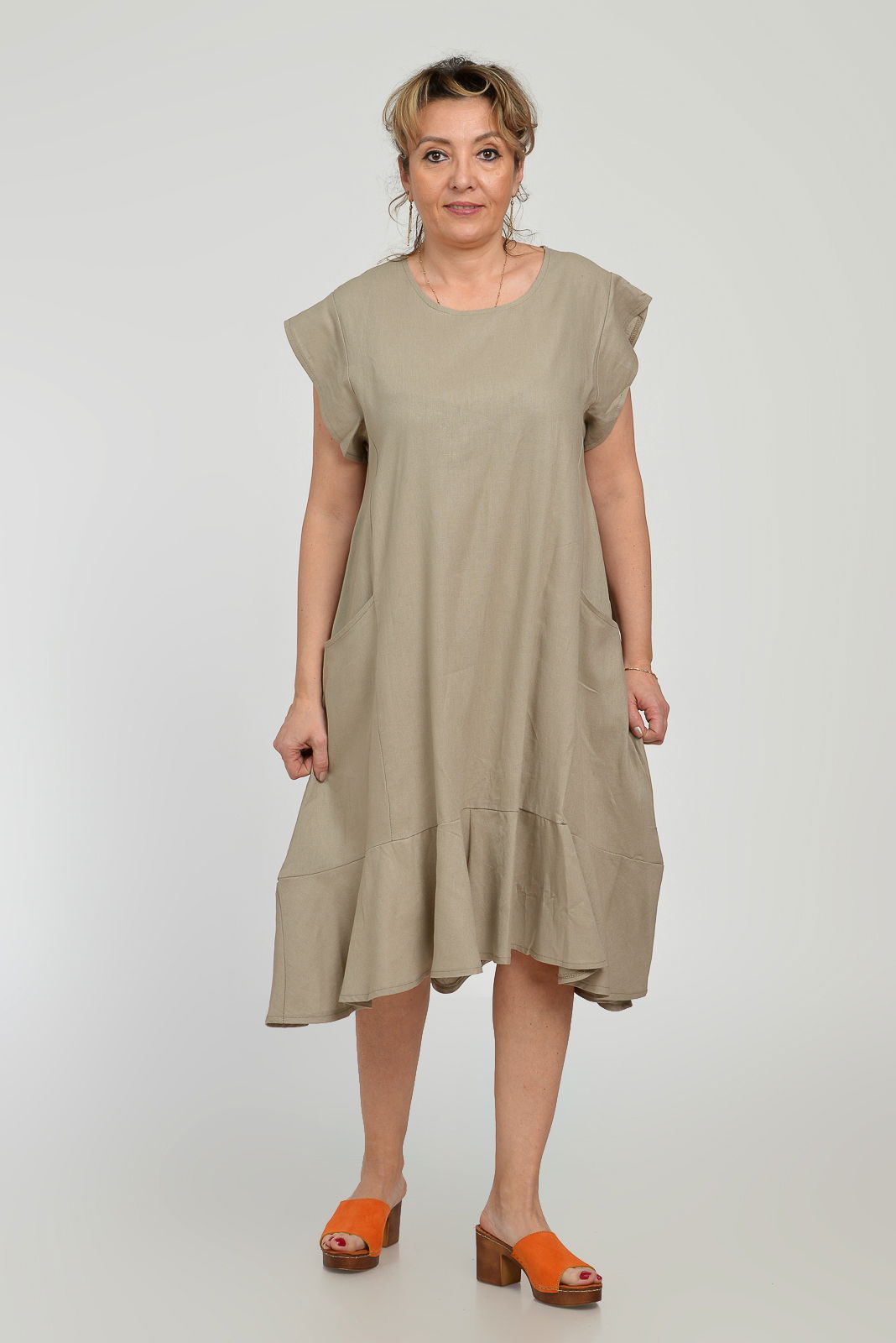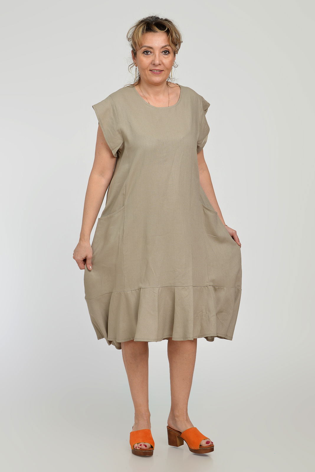 Pierino Rochie midi A-line din in mercerizat cu buzunare si volan, bej