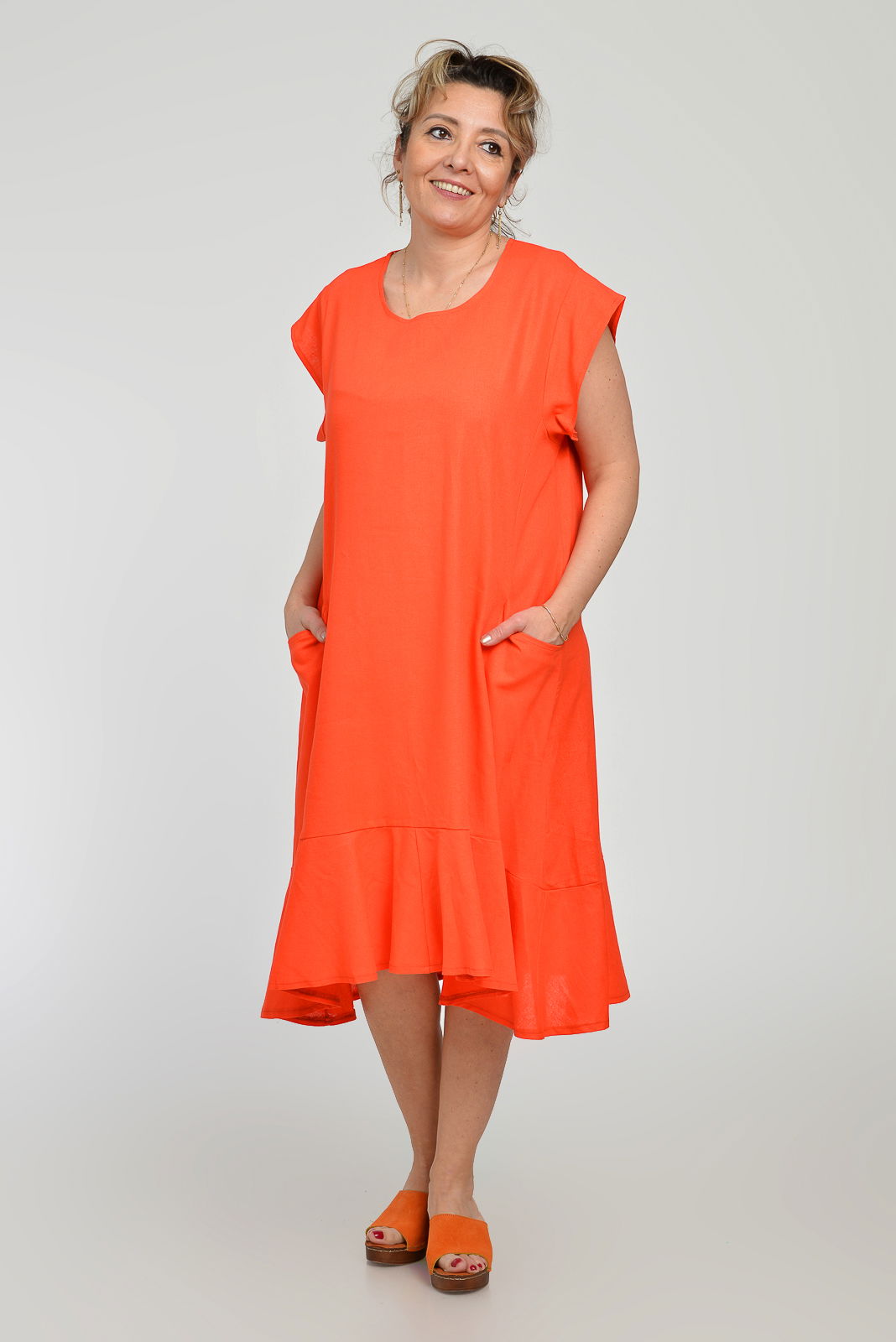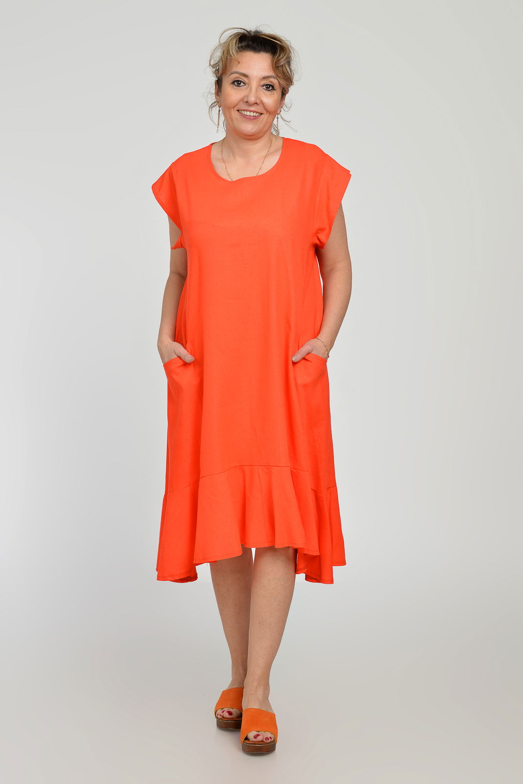 Pierino Rochie midi A-line din in mercerizat cu buzunare si volan, corai