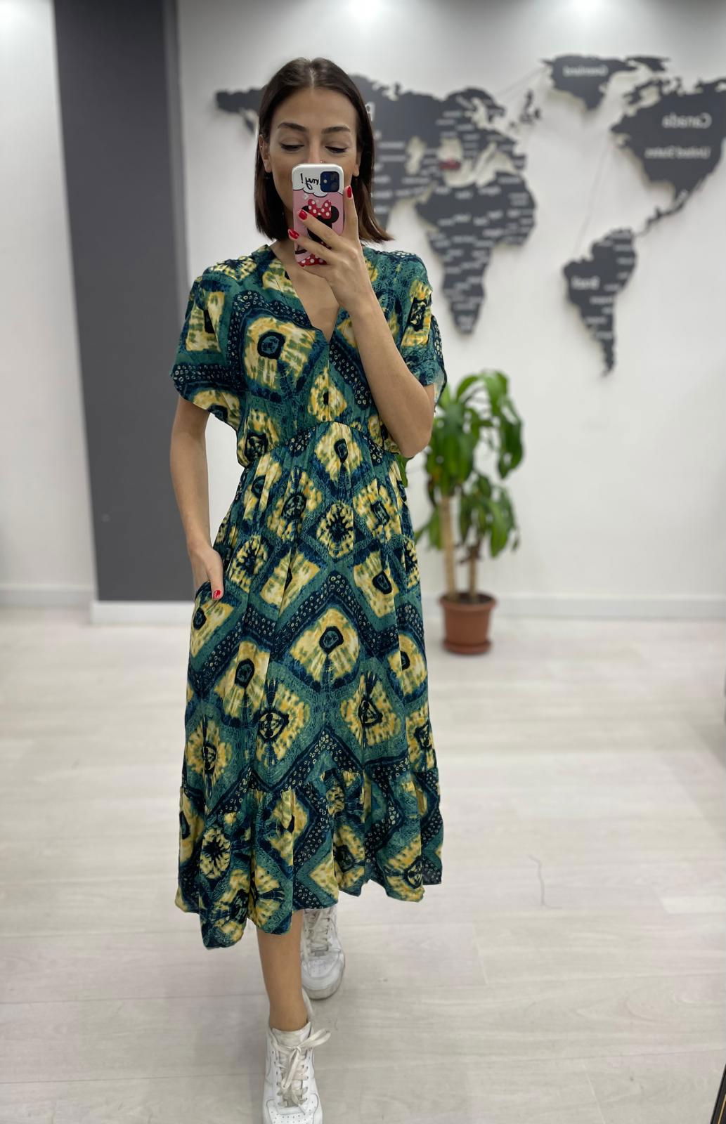 Rochie midi din bumbac, cu elastic in talie si imprimeu galben pe fond turcoaz