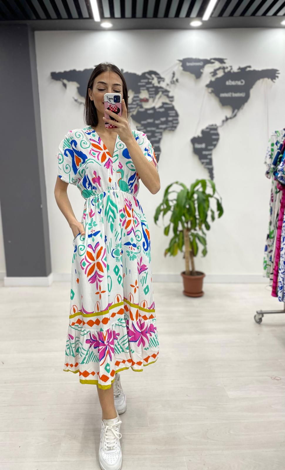 Rochie de vară din bumbac fin, ușoară și confortabilă, perfectă pentru zilele călduroase. Cu lungime midi și croială lejeră, oferă libertate de mișcare și un aer relaxat, dar feminin. Materialul natural permite pielii să respire, iar imprimeul colorat adaugă un strop de veselie oricărei ținute. Ideală pentru plimbări, vacanțe sau ieșiri casual în oraș.