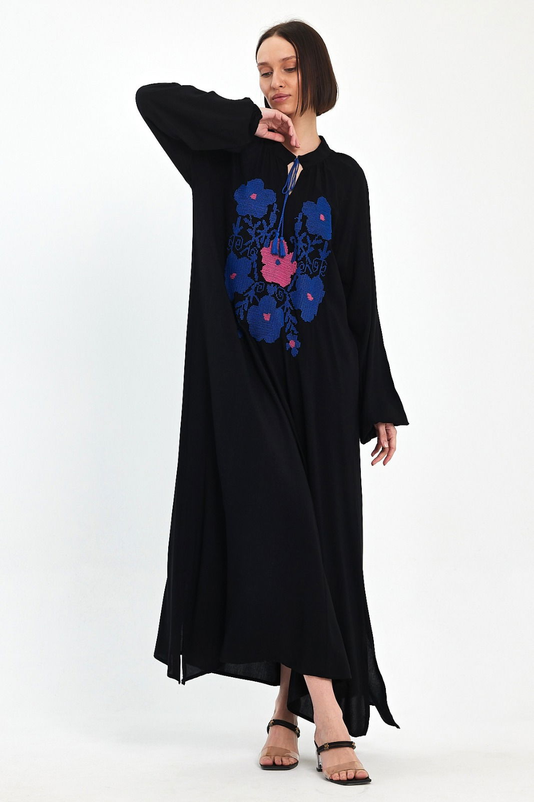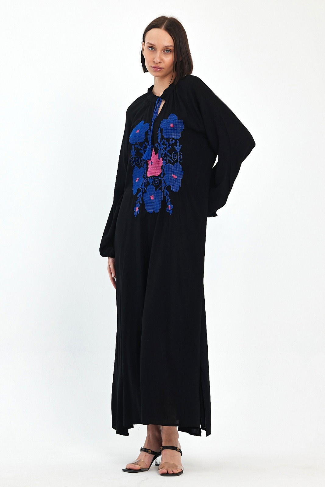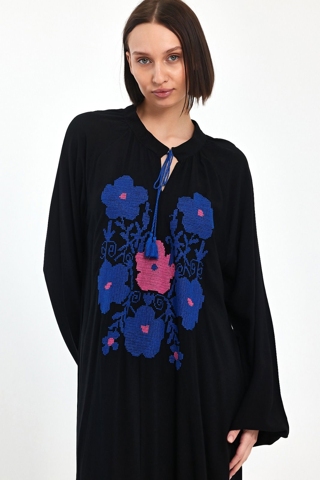 Rochie neagra A-line cu broderie traditionala pe piept, din vascoza