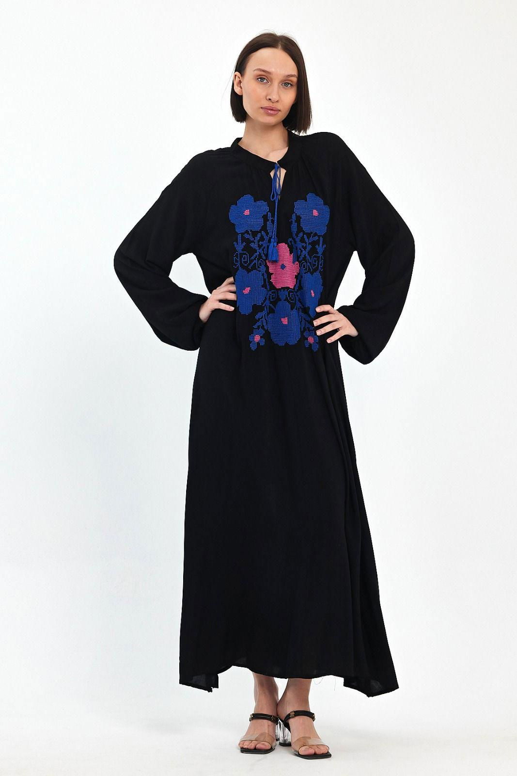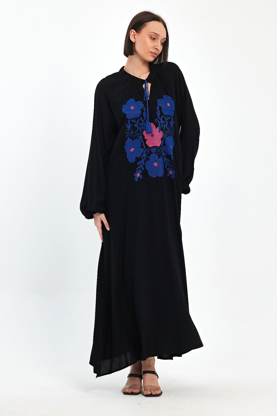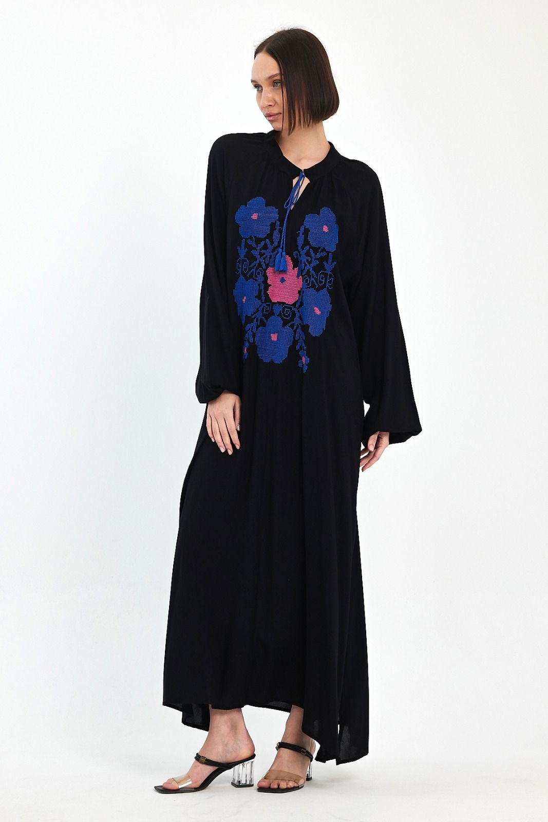 Rochie neagra A-line cu broderie traditionala pe piept, din vascoza