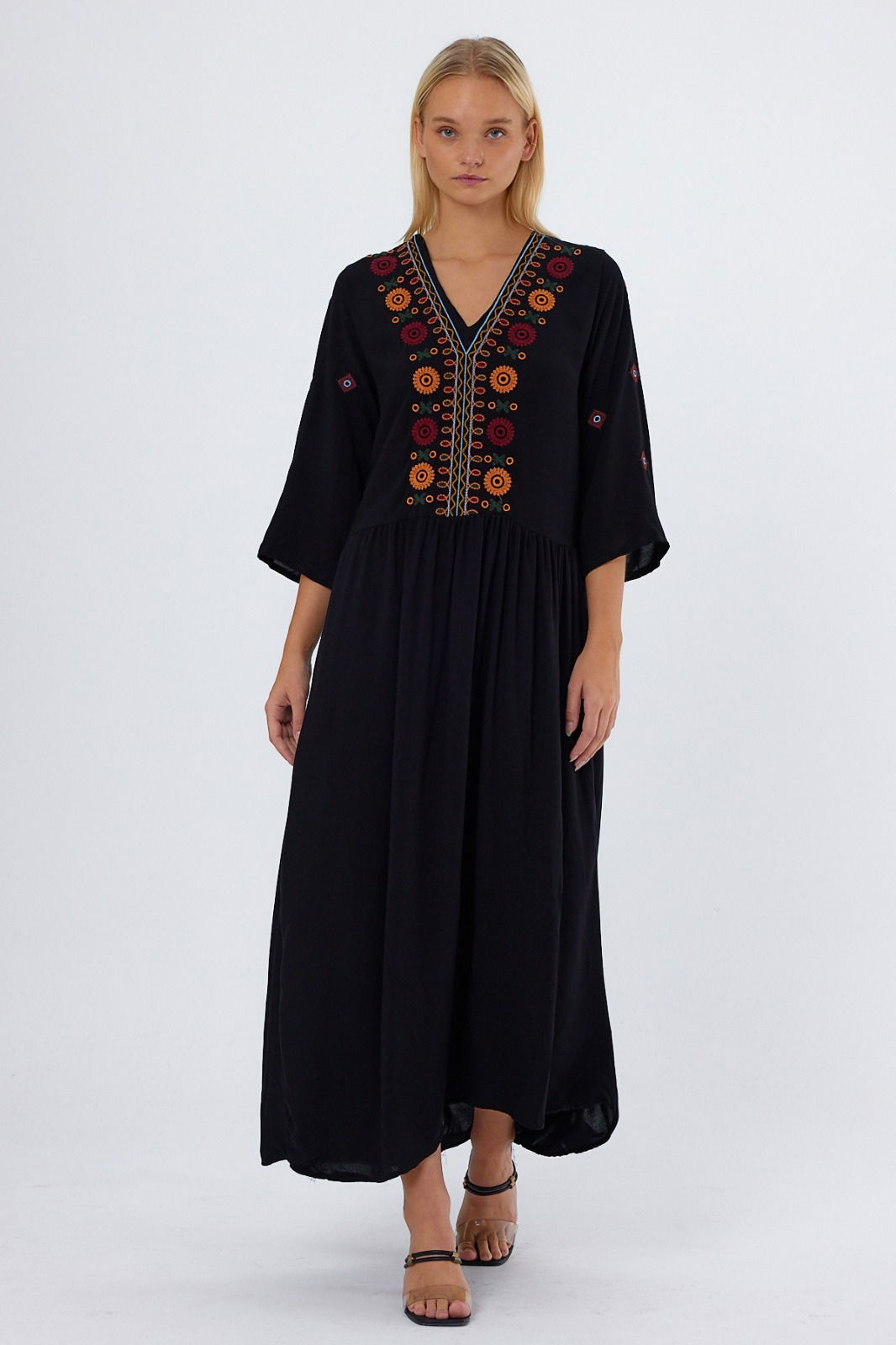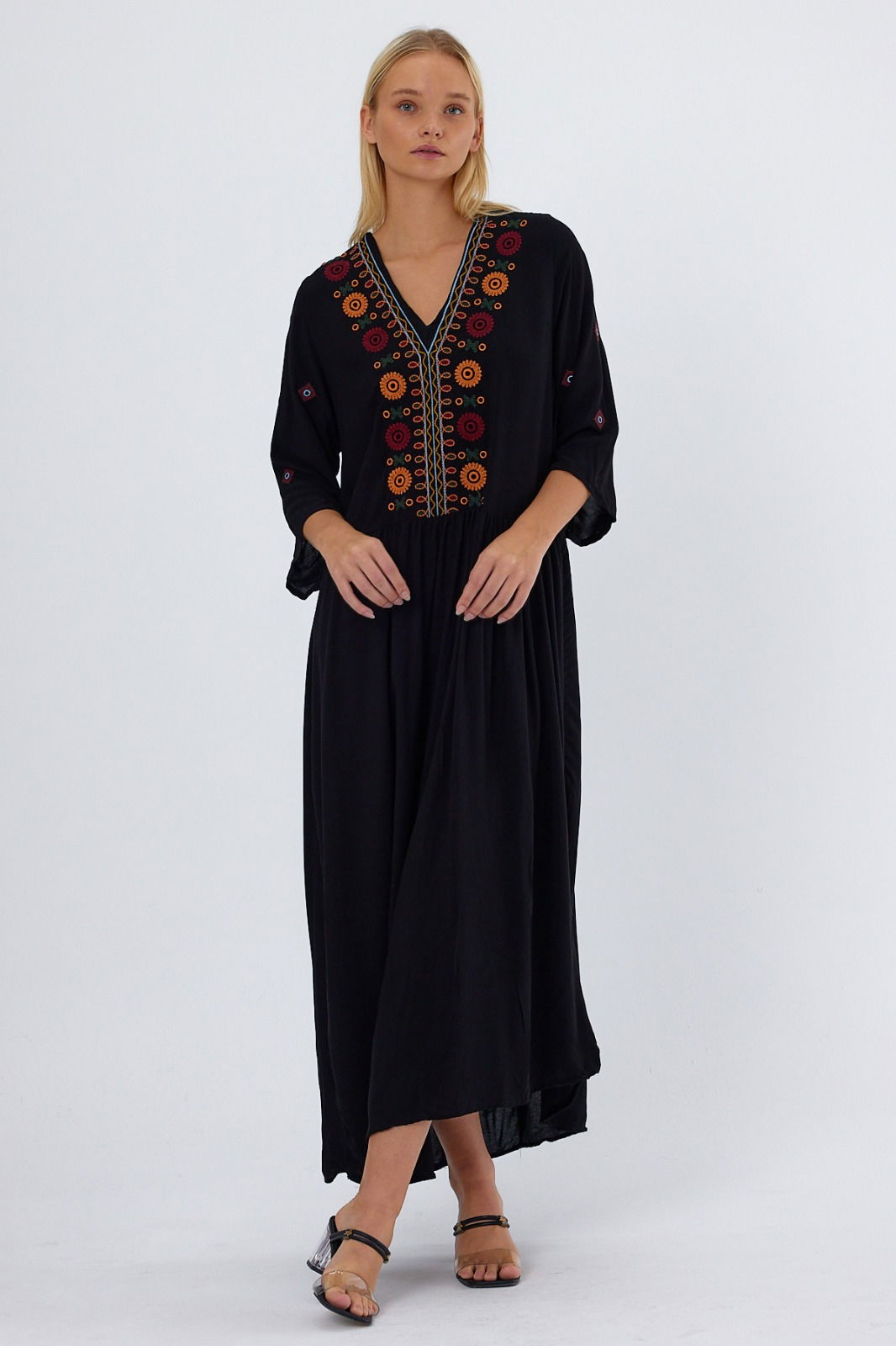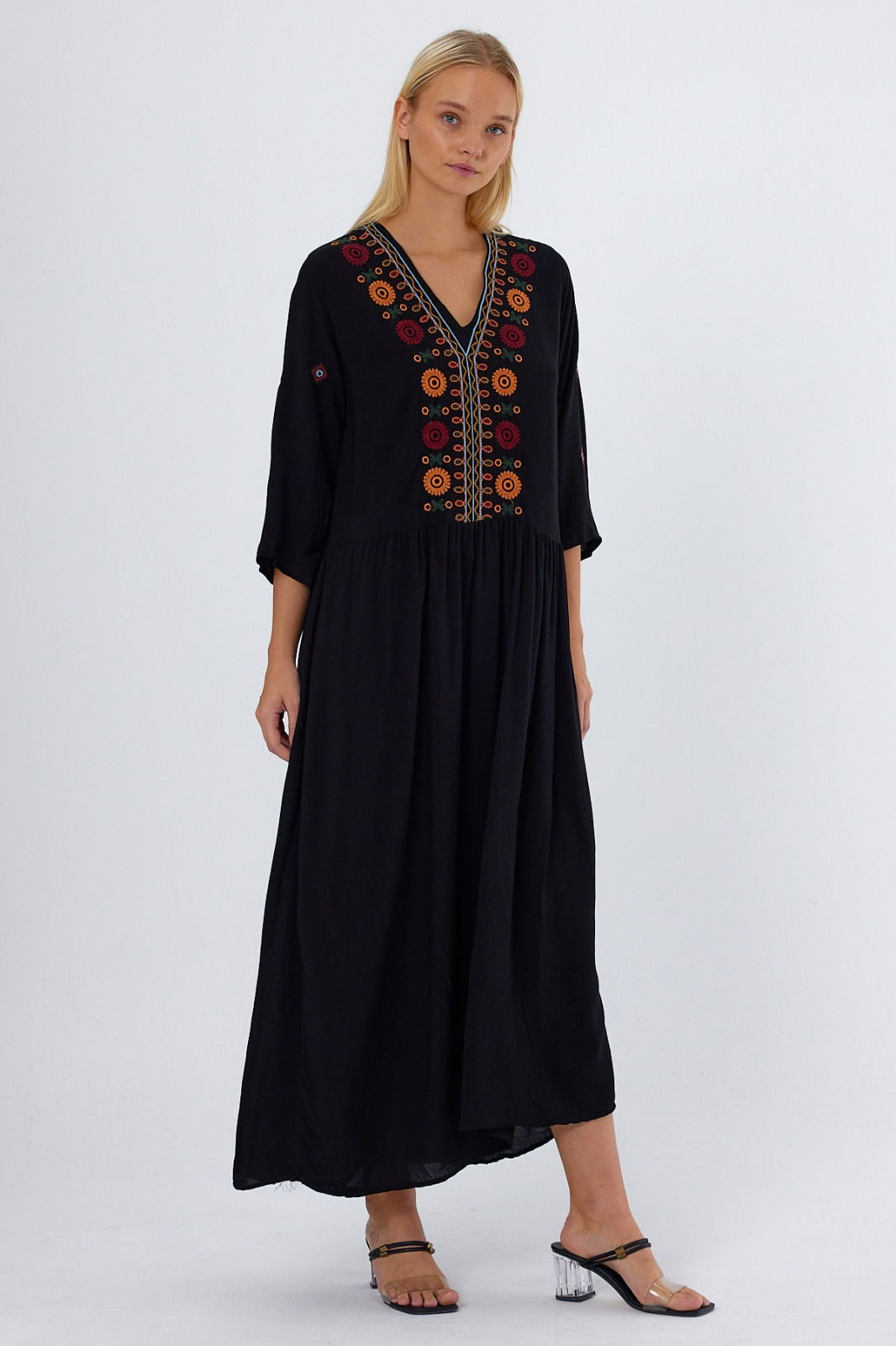 Rochie neagra cu broderie pe piept si maneci, din vascoza