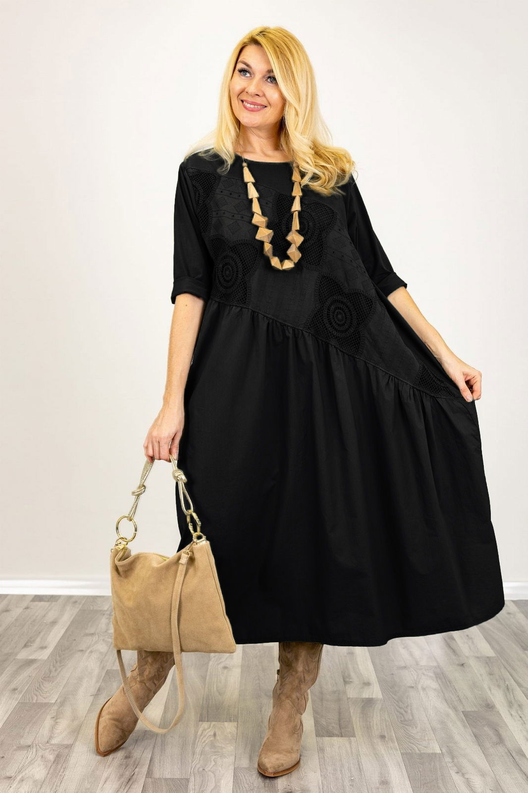 Rochie neagra cu taietura oblica si broderie, din poplin si jerseu, oversize