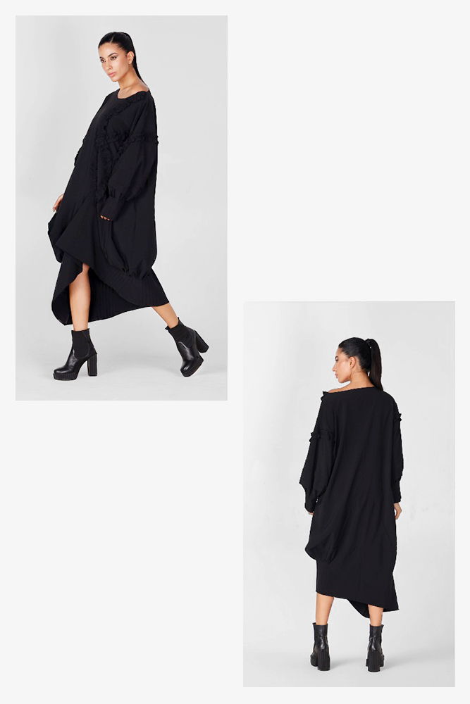 H-4 Rochie neagra in colturi cu maneci bufante si aplicatii volane, oversize