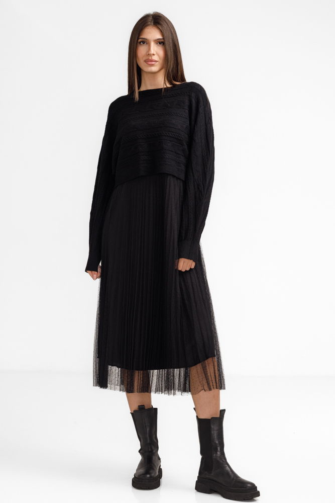 Rochie dama moderna si feminina, cu fusta plisata din tull si pulover tricotat scurt integrat. Designul 2 in 1 ofera un look chic si versatil, perfect atat pentru tinute casual, cat si pentru iesiri in oras sau evenimente de zi.