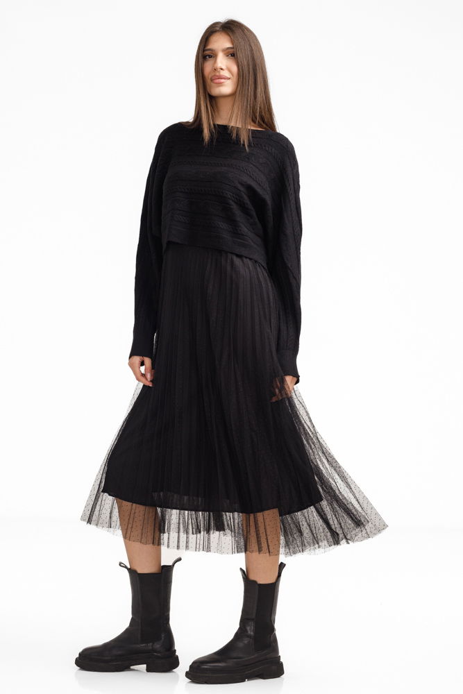 Rochie suprapusa din tulle cu bulinute cu puloveras cu model, neagra