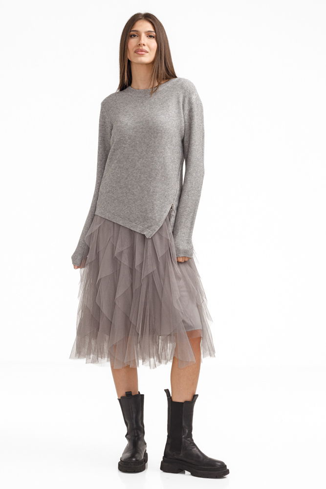 Rochie dama moderna tip 2 in 1, cu fusta midi din tull si pulover tricotat suprapus. Designul ingenios imbina feminitatea tullului cu confortul tricotului, oferind o tinuta casual chic perfecta pentru sezonul rece. Versatila si stilata, rochia poate fi purtata atat cu bocanci, cat si cu incaltaminte eleganta, adaptandu-se usor oricarei ocazii de zi.
