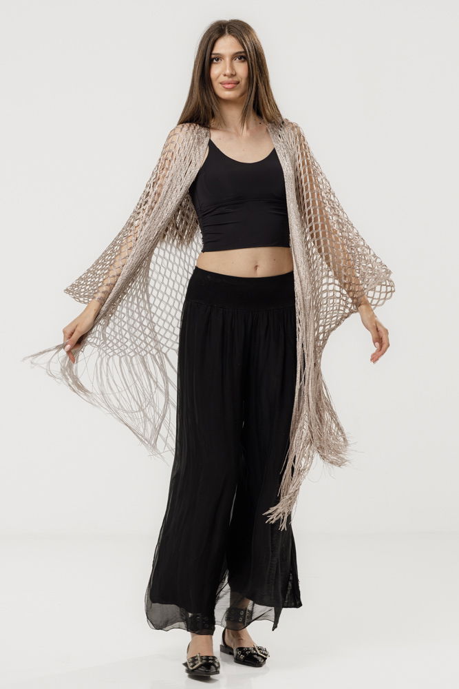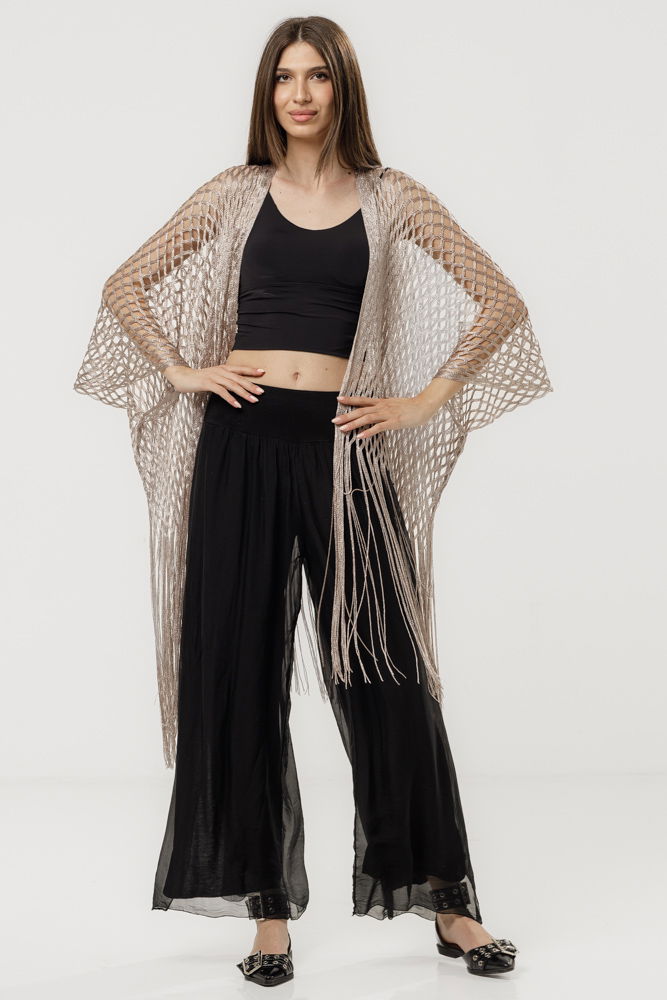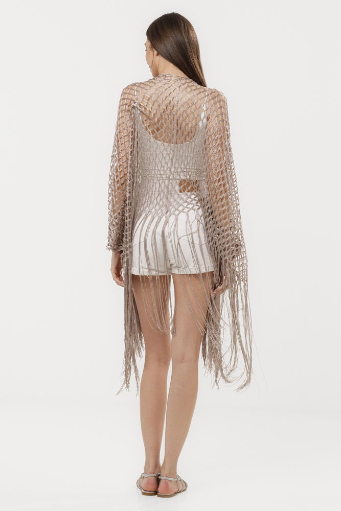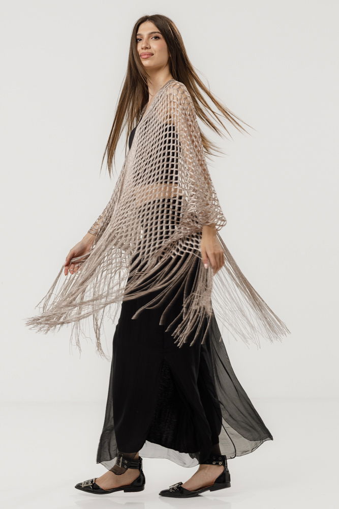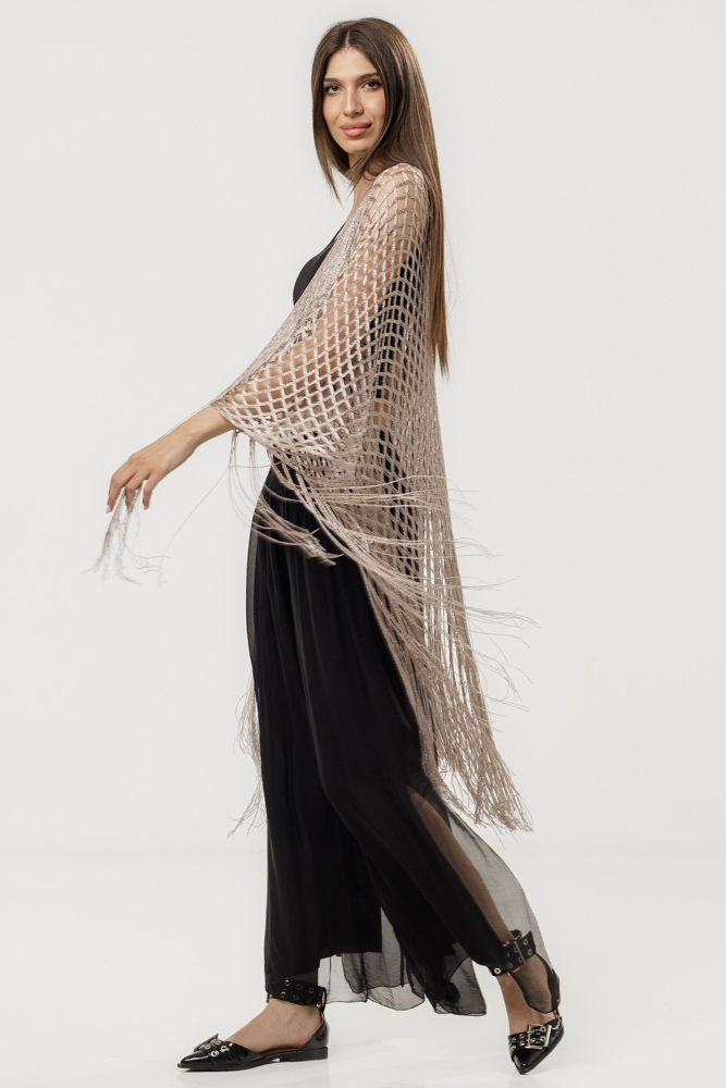 Shopika Poncho bej fango din plasa cu fir argintiu si franjuri lungi