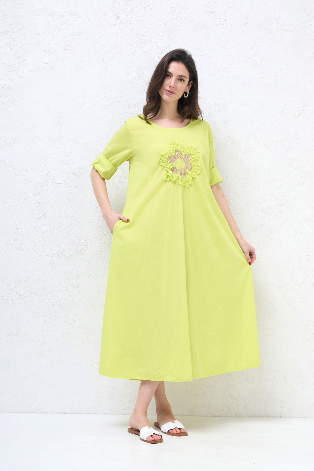 Shopika Rochie lunga A-line cu floare paiete aurii mate, din poplin de bumbac, verde lime