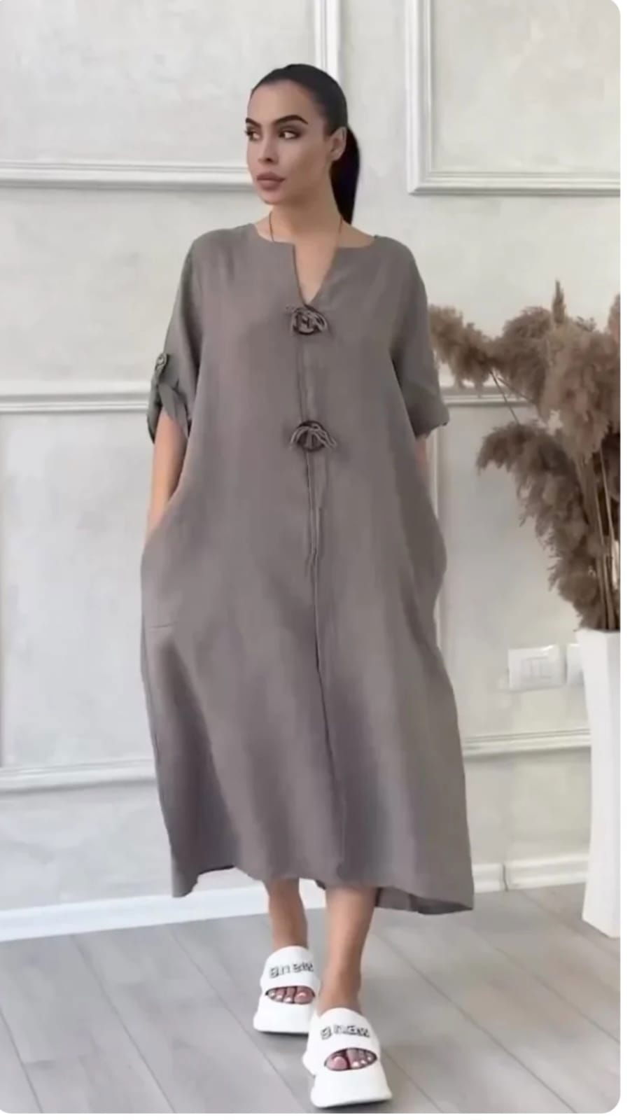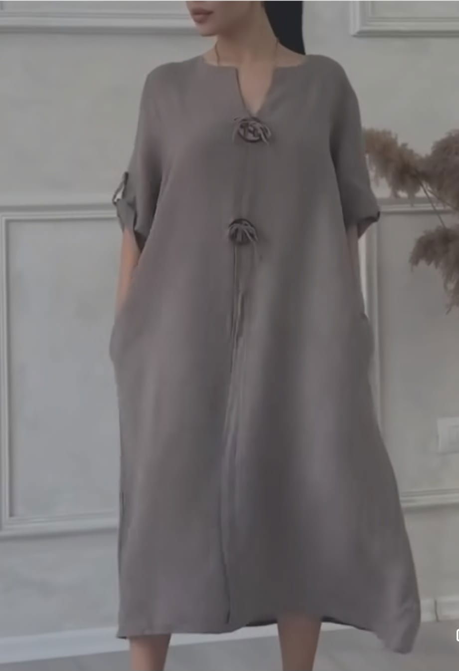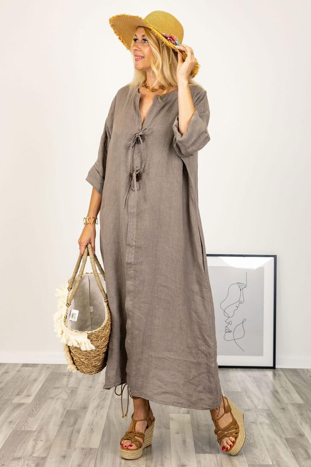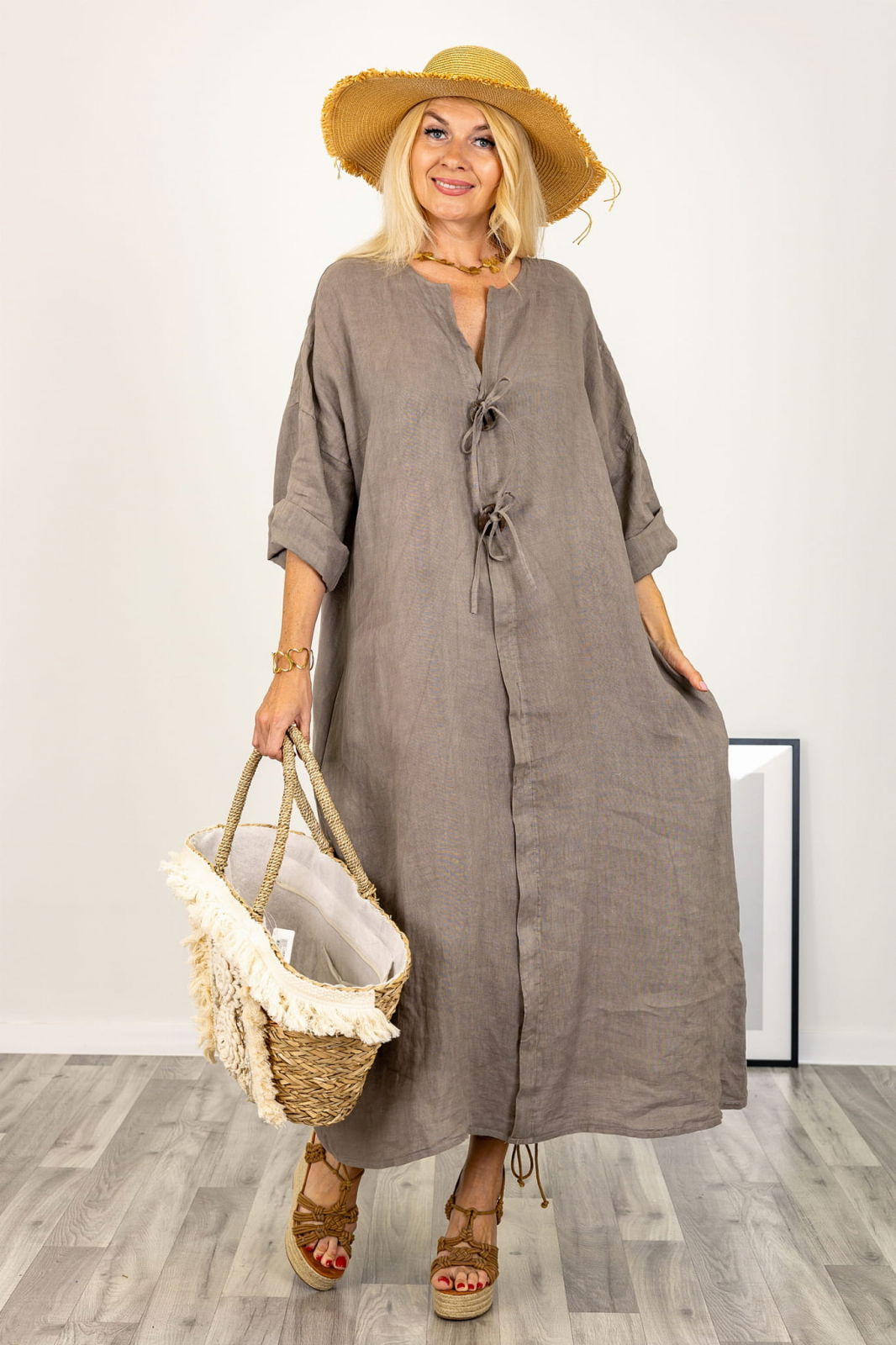 Shopika Rochie din in, cu doi nasturi decorativi pe piept, bej inchis