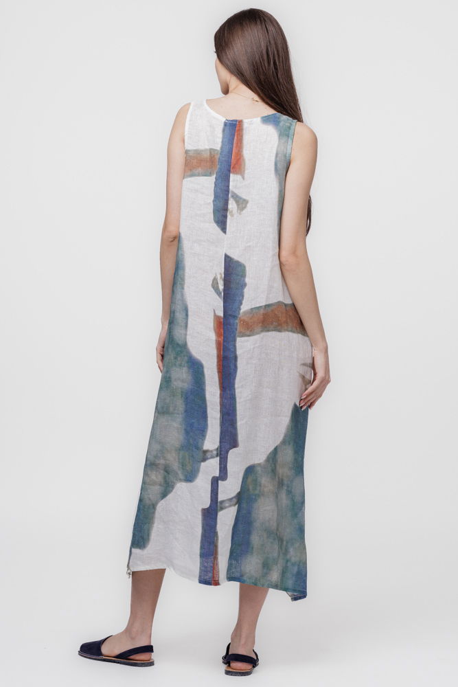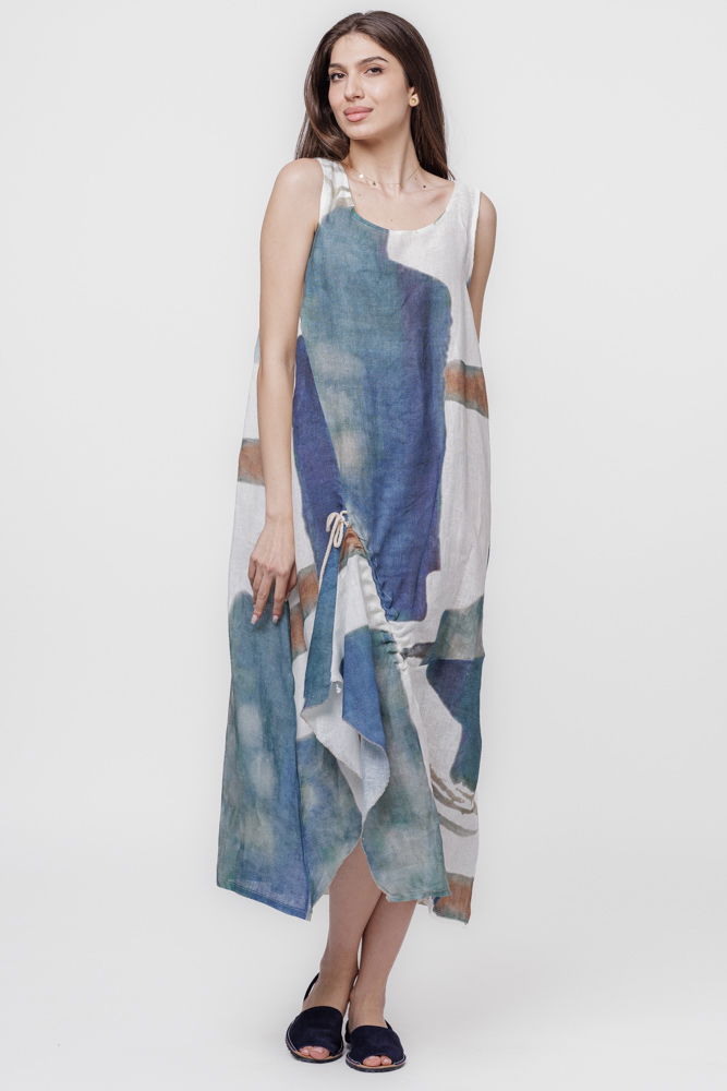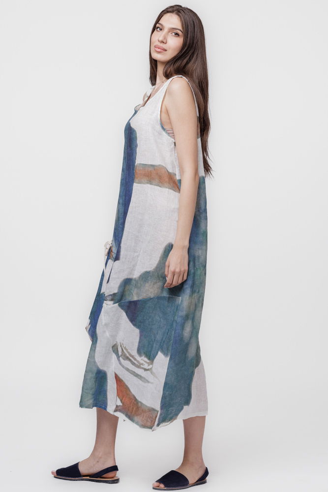 Shopika Rochie lunga asimetrica A-line din in cu snur pe fata si imprimeu pictural