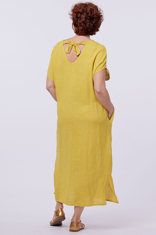 Rochie lunga din in cu imprimeu pictural floral si funda pe spate, pe fond galben