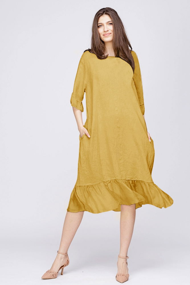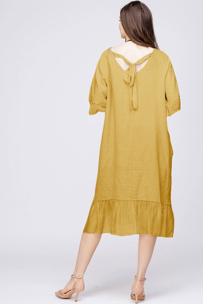 Rochie midi din in galbena cu volane din matase si funda pe spate