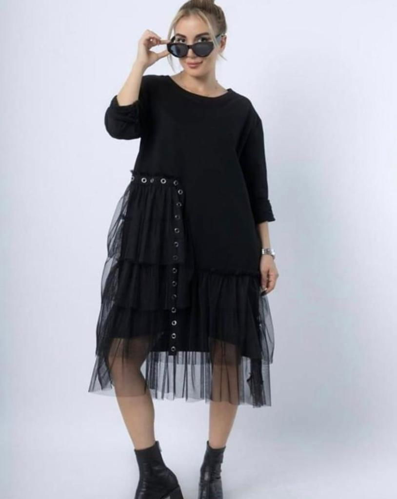 Shopika Rochie neagra din bumbac cu volan din tulle si cordon cercuri metalice argintii