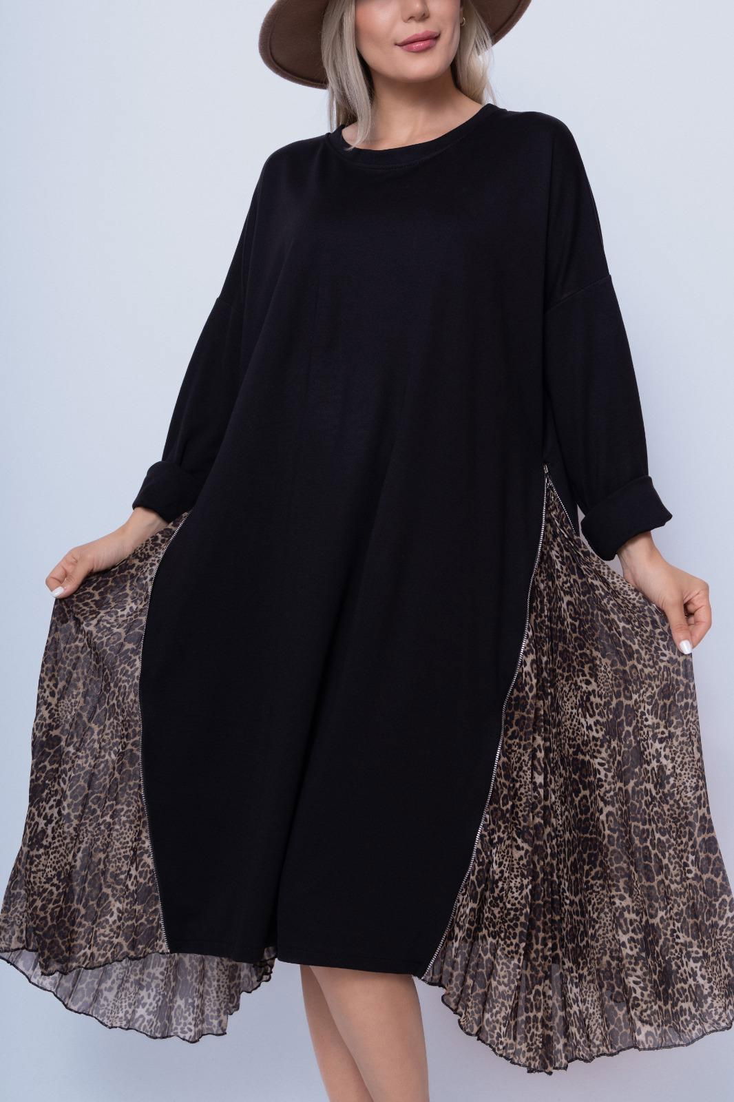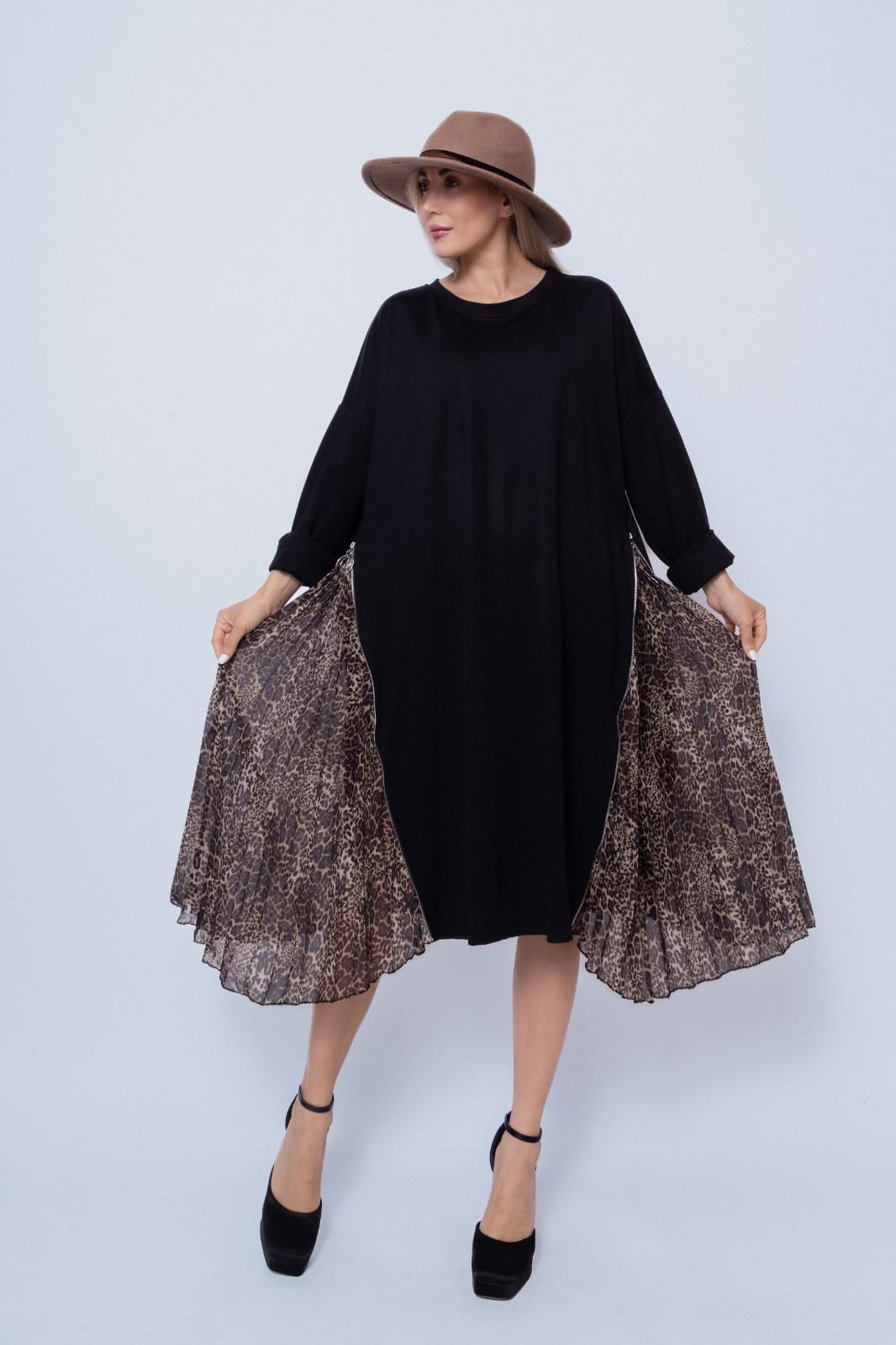 Rochie neagra midi in colturi cu laterale din voal plisat animal print si fermoare metalice argintii