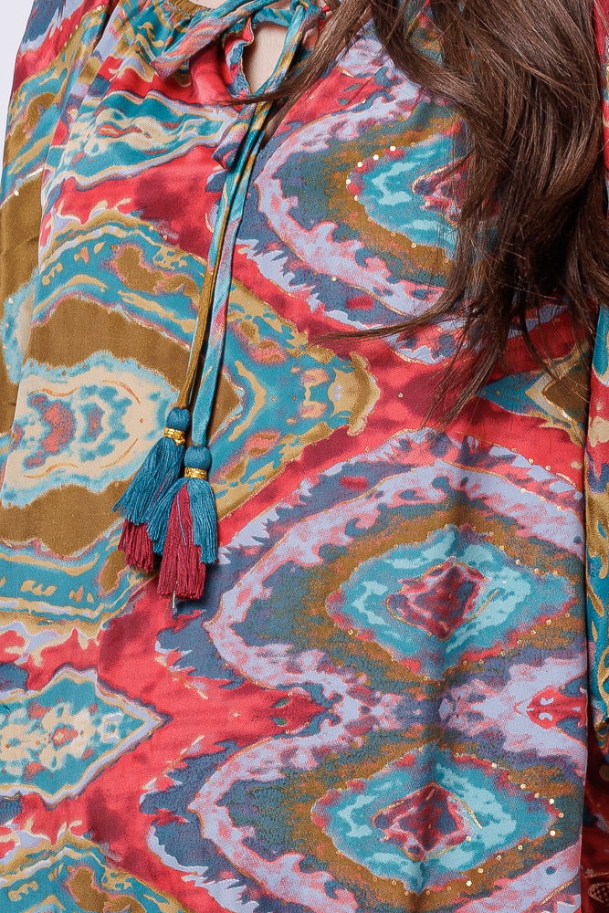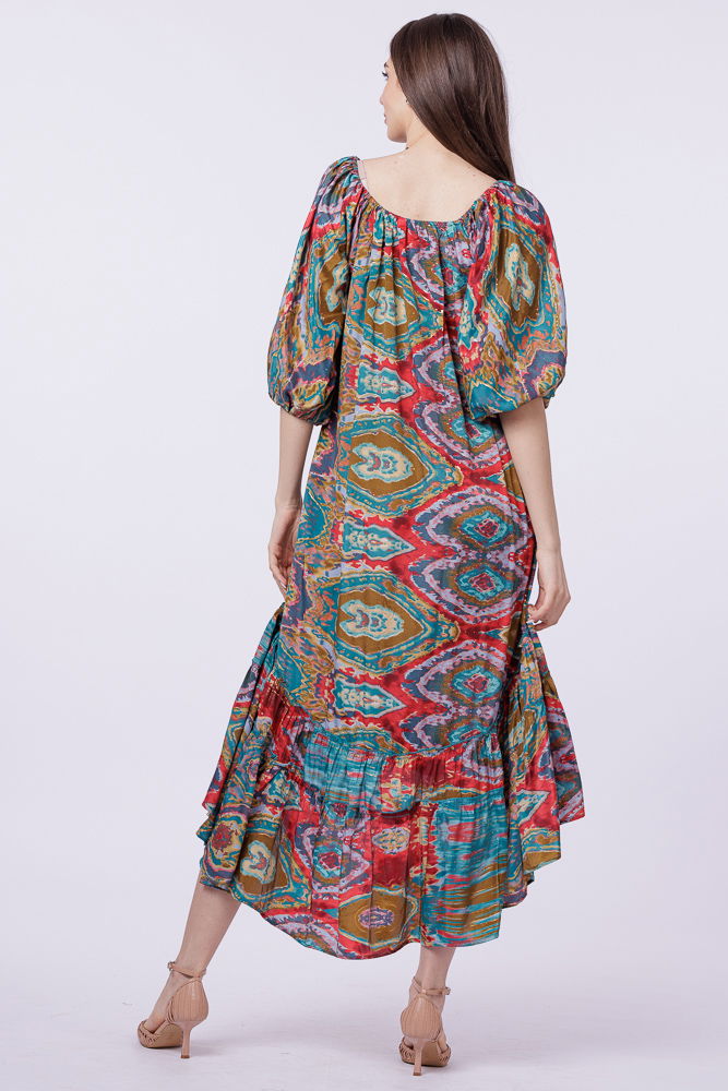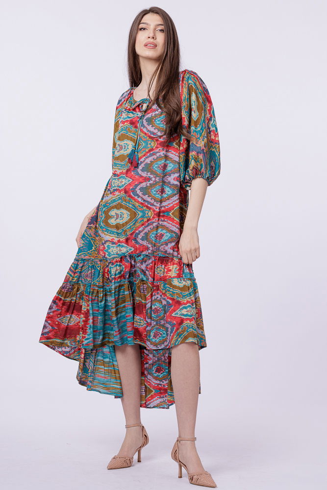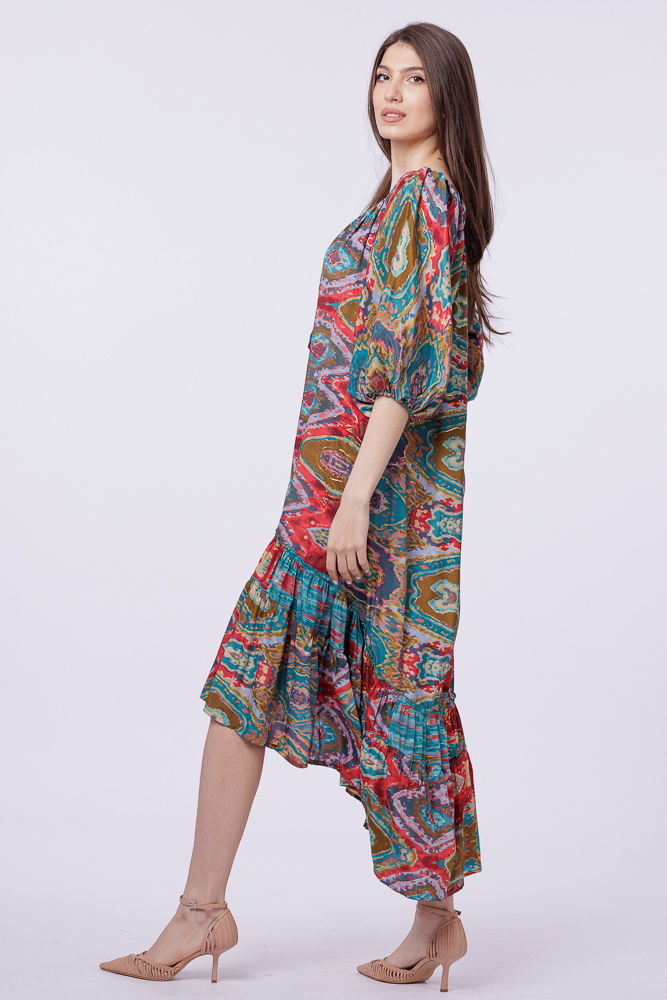 Rochie asimetrica din matase indiana, cu maneci bufante si elemente aurii