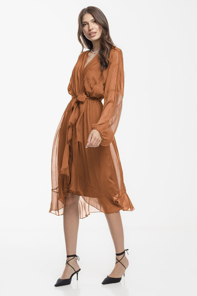 Shopika Rochie eleganta din matase si vascoza, petrecuta, cu maneci vaporoase si croiala asimetrica, camel