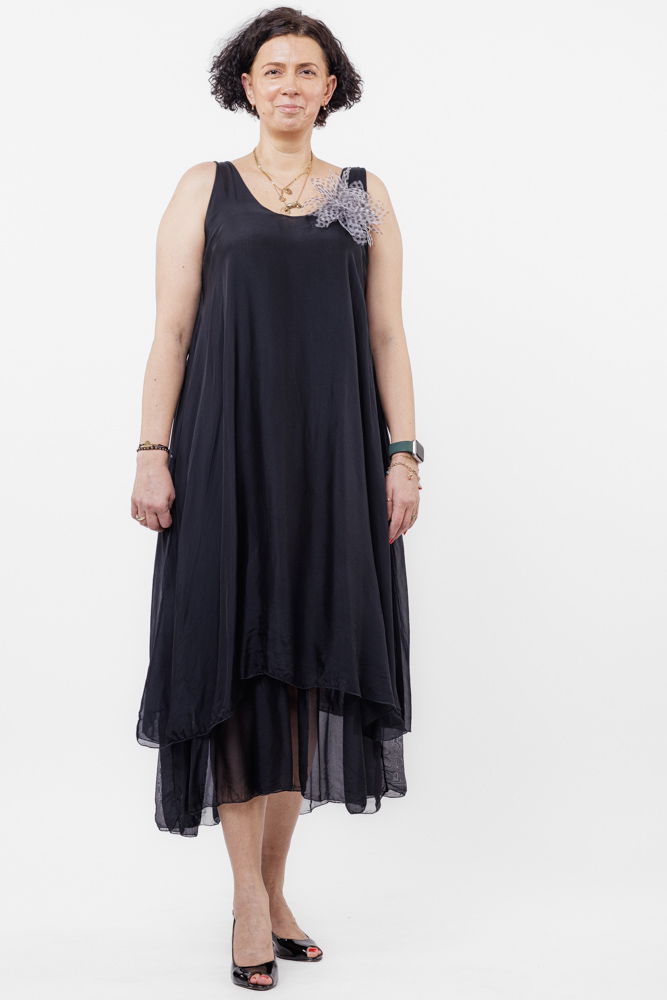Shopika Rochie lunga A-line, suprapusa, din matase si vascoza, neagra