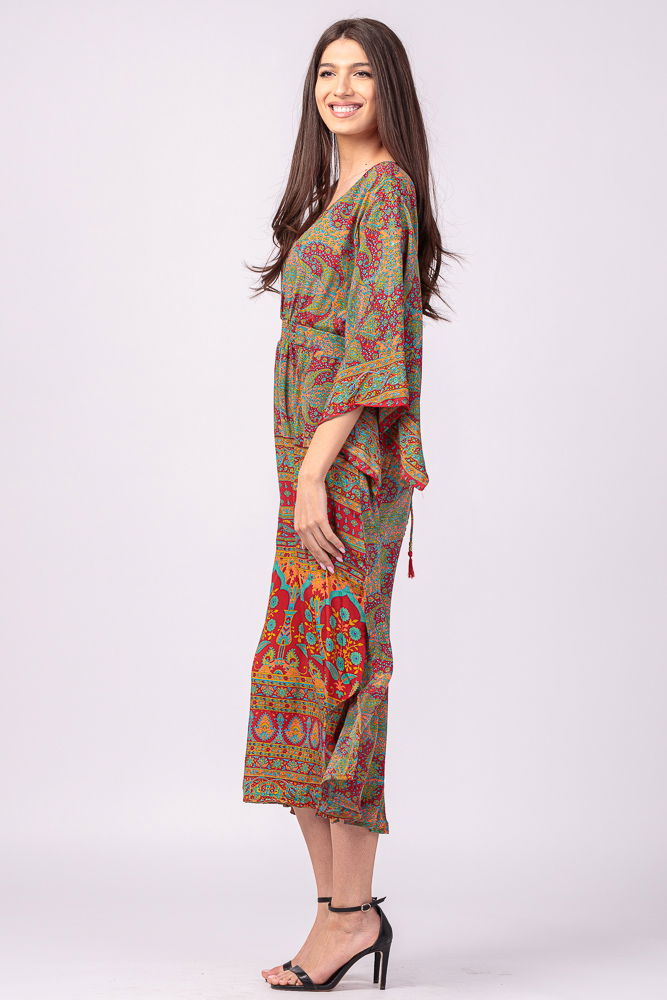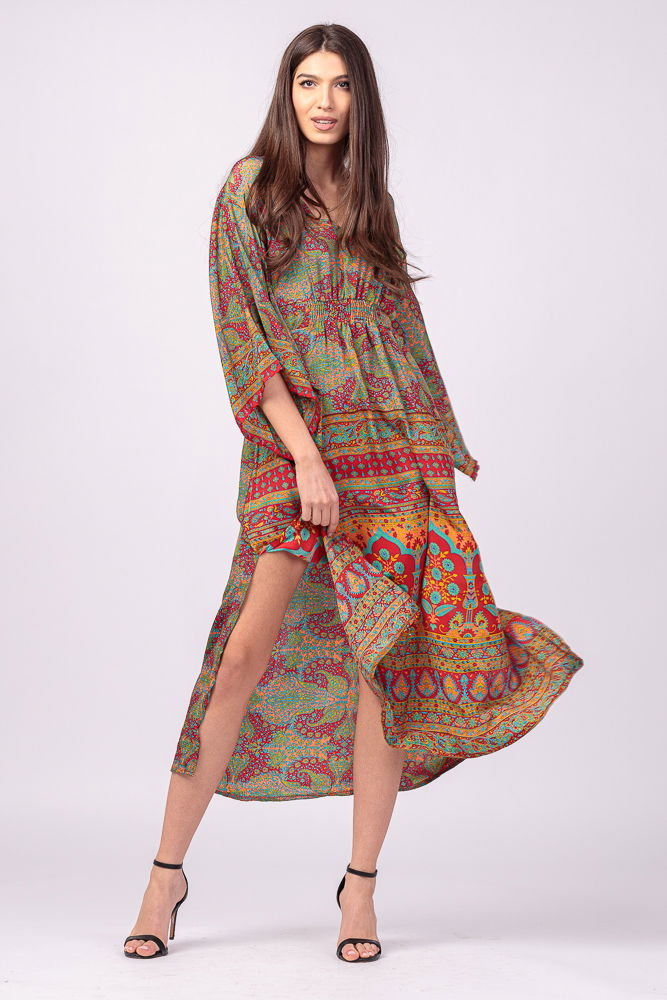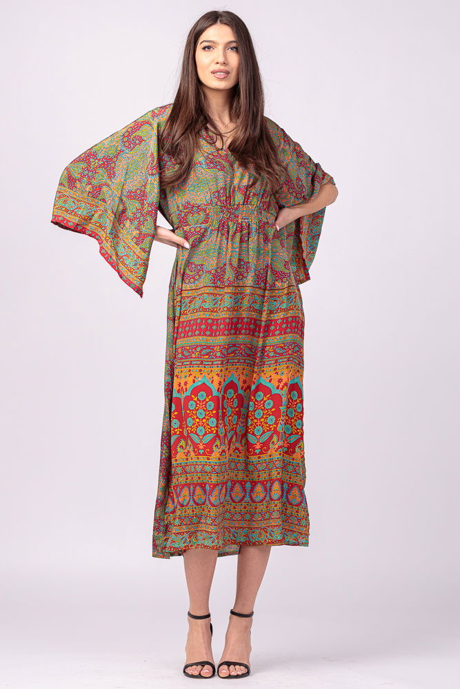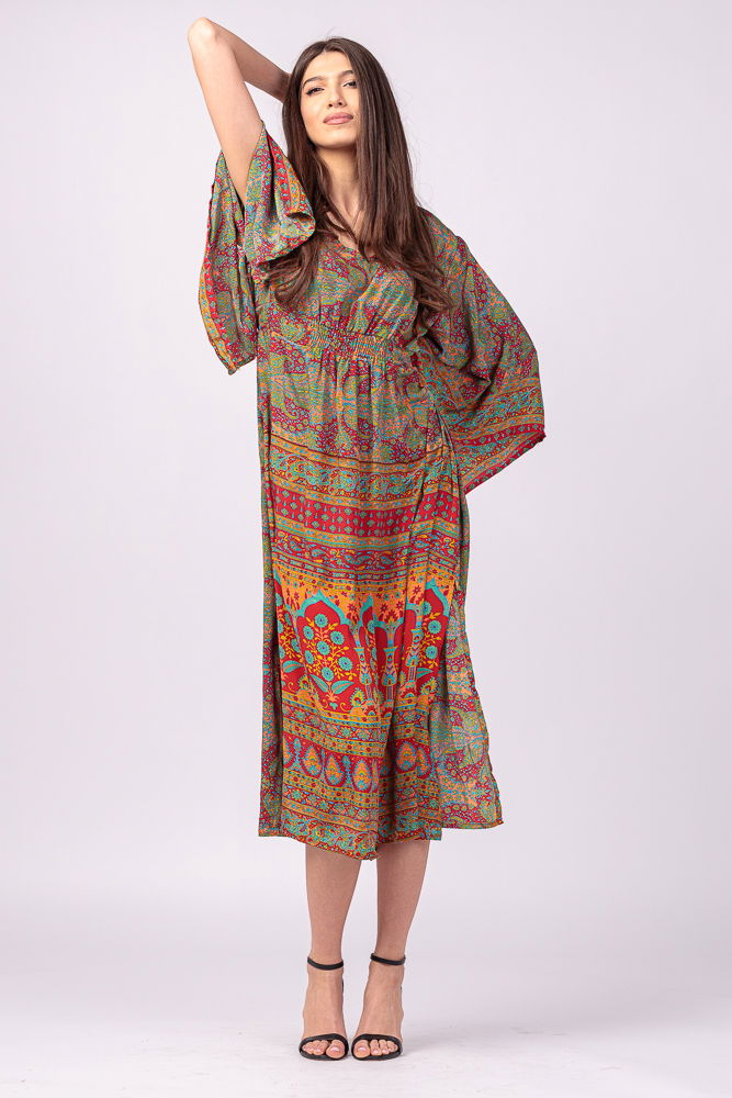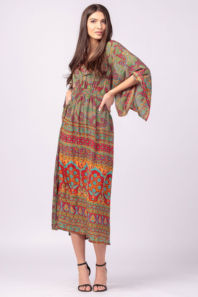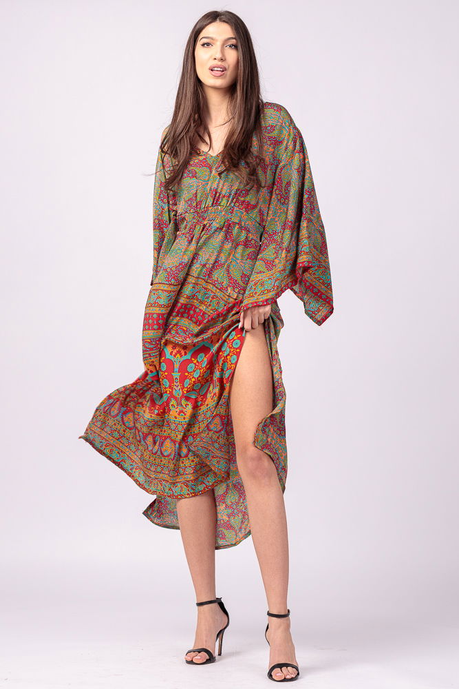 Rochie lunga din matase indiana cu maneca ampla si imprimeu arabesque rosu-verde