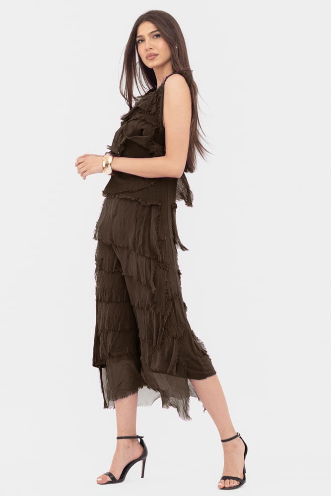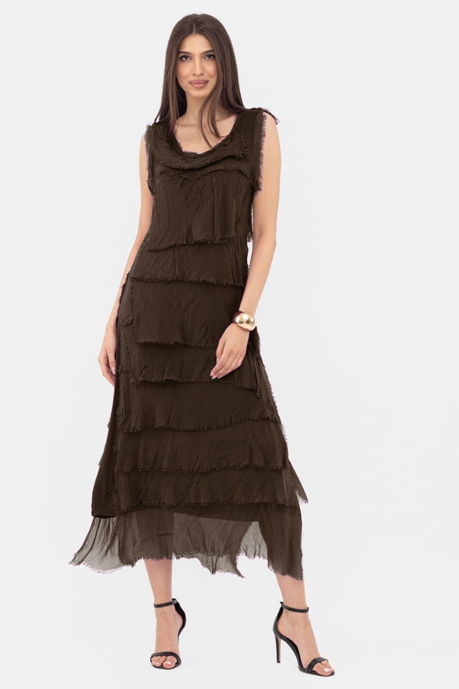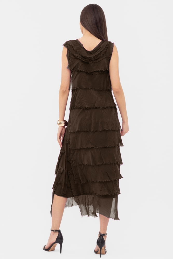 Shopika Rochie maro inchis din matase si vascoza cu volane franjurate suprapuse, fara maneci