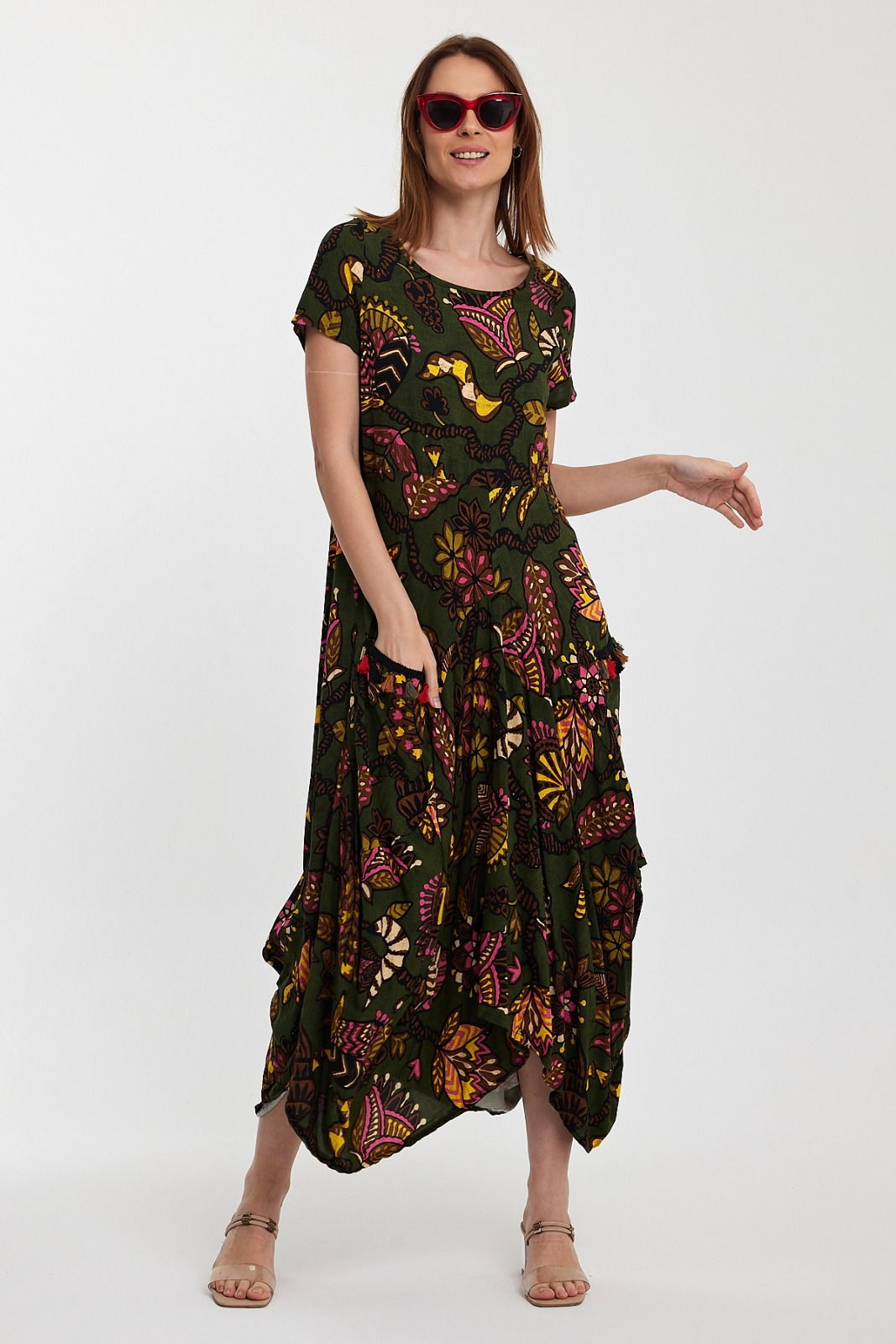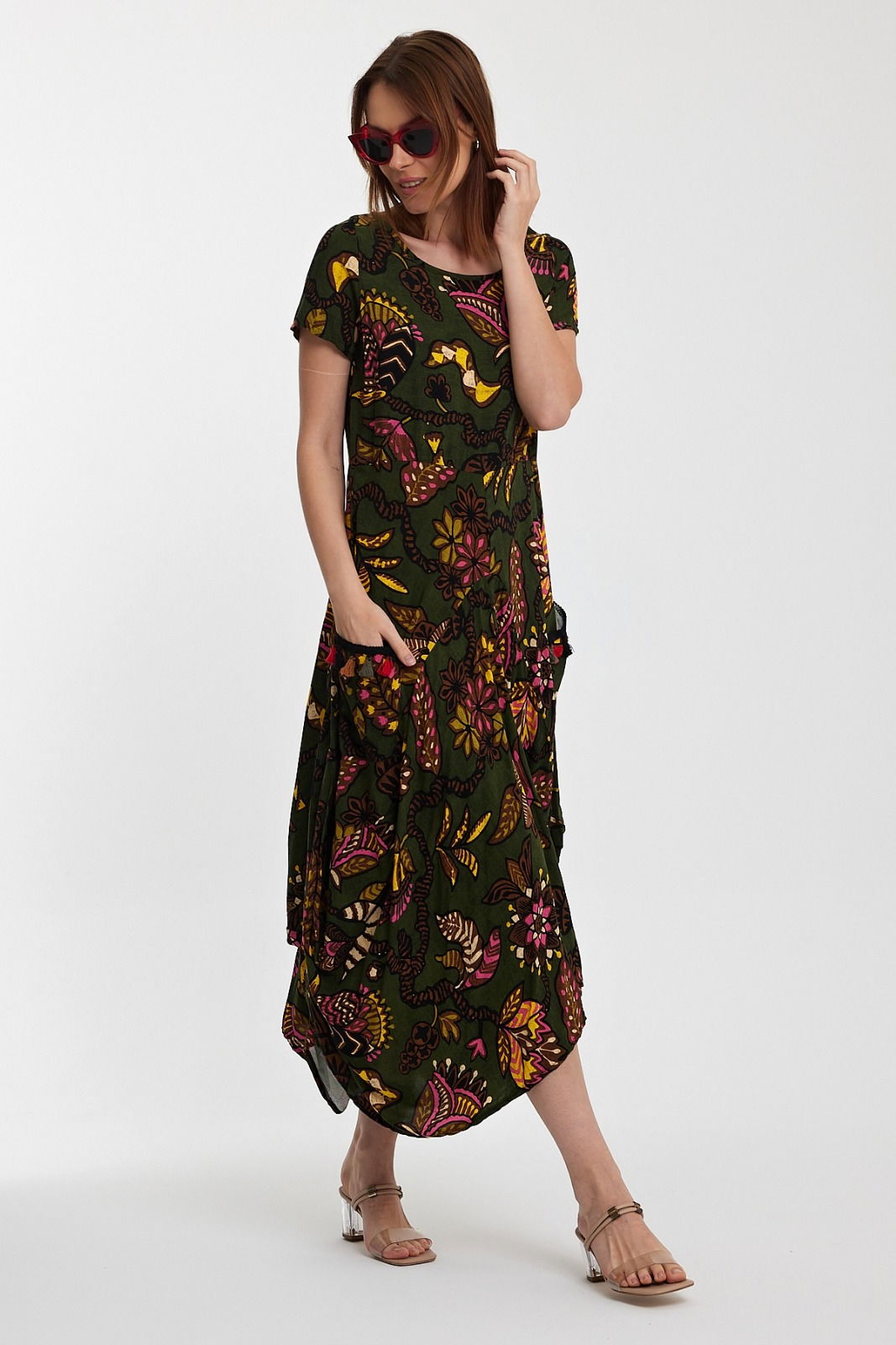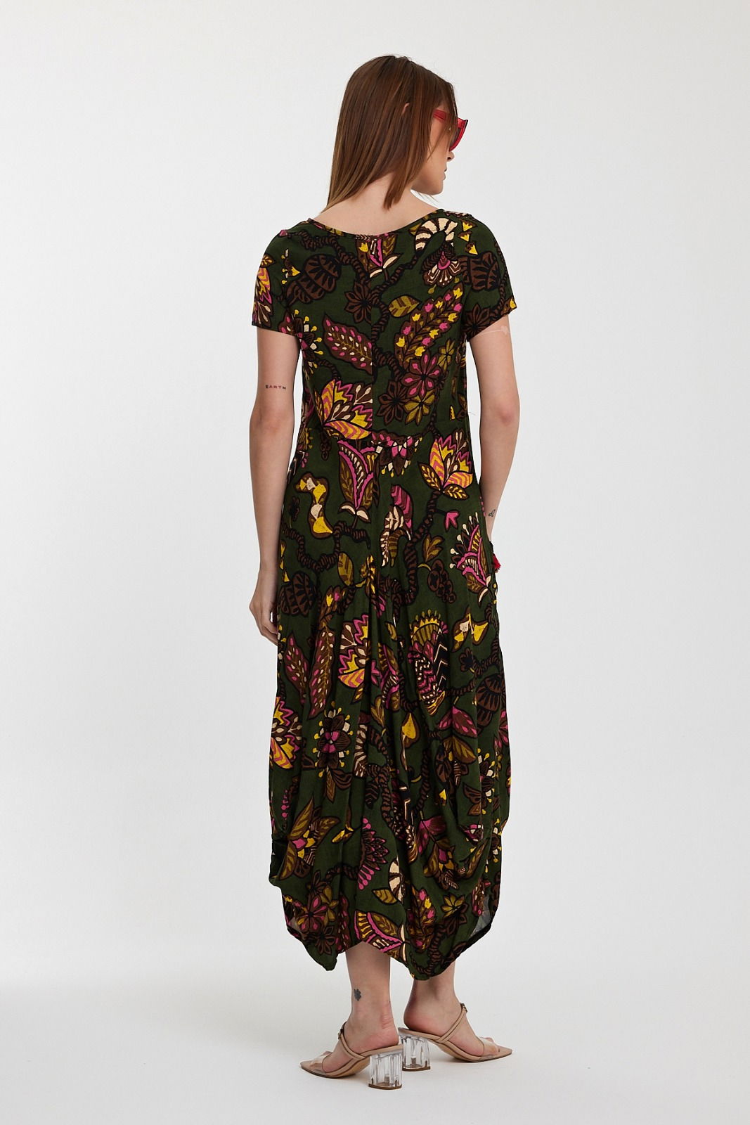 Rochie kaki, lalea, in colturi, cu imprimeu, din vascoza