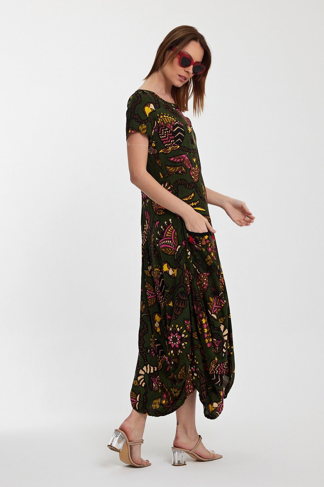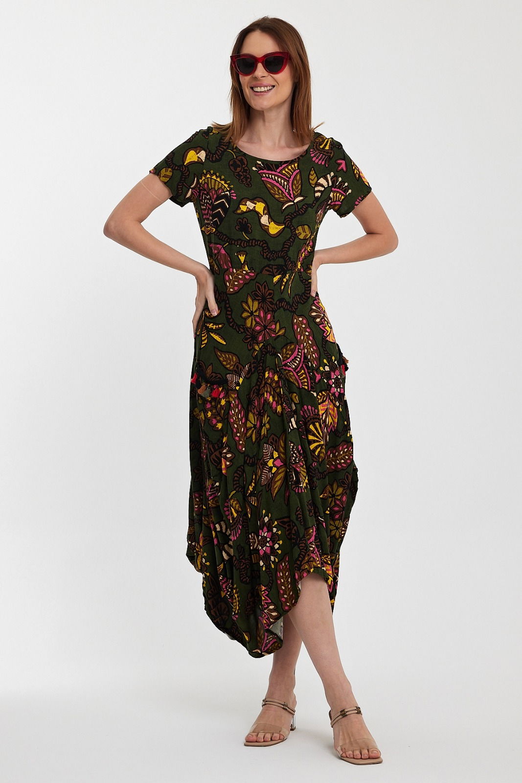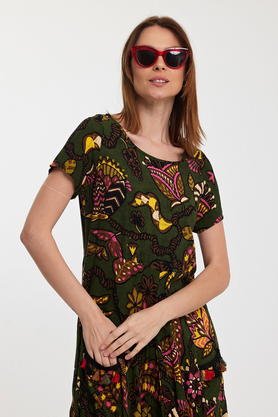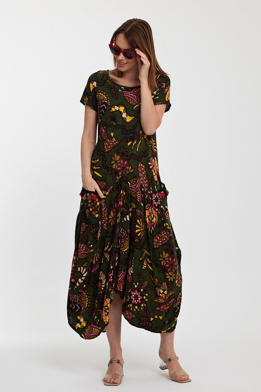 Rochie kaki, lalea, in colturi, cu imprimeu, din vascoza