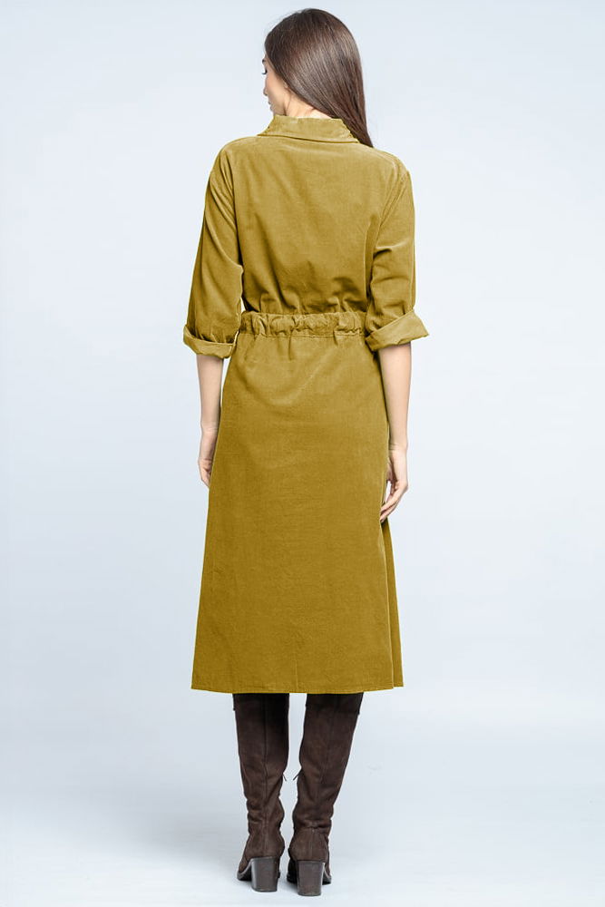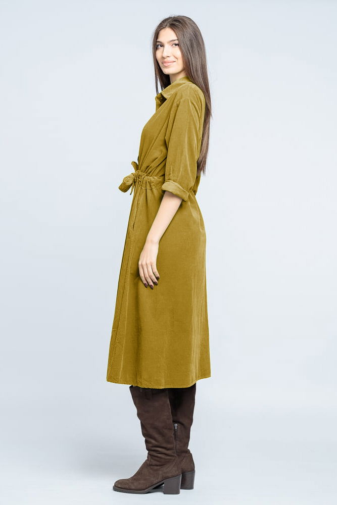 Shopika Rochie camasa din catifea reiata, galben mustar, cu cordon in talie