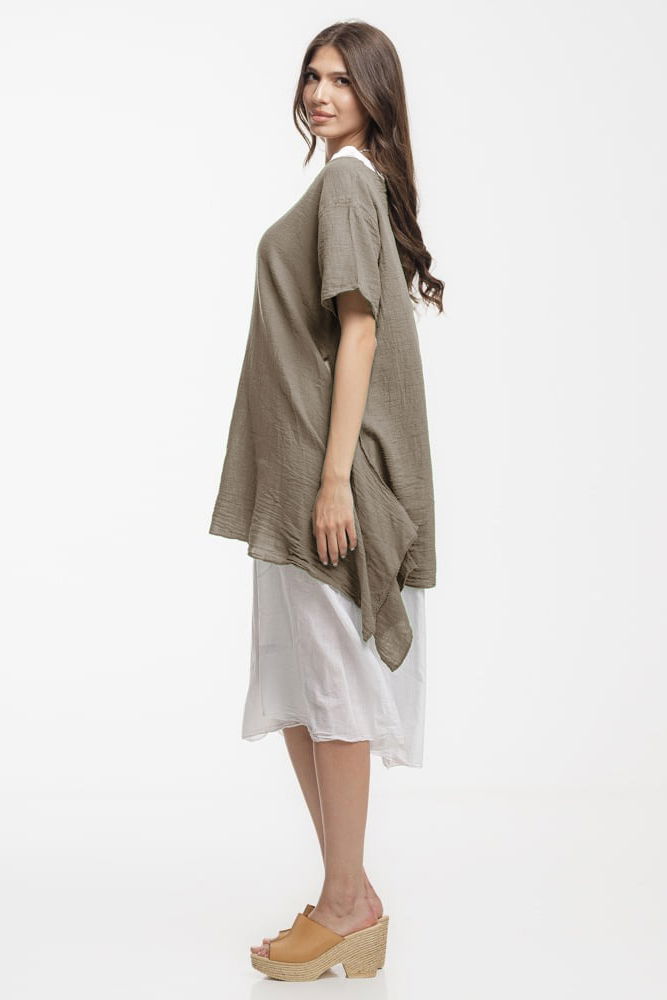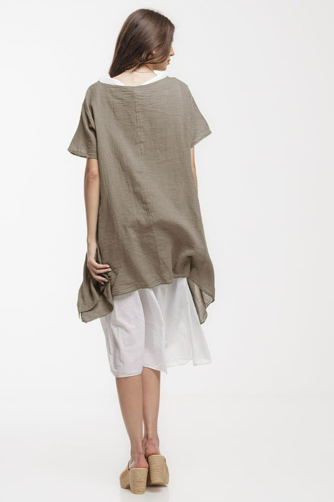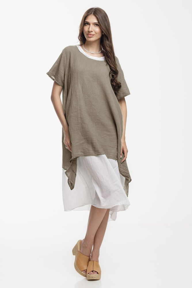Rochie vaporoasa de vara, realizata integral din bumbac natural, ideala pentru zilele calduroase. Designul in doua straturi ofera un efect elegant si aerisit: stratul superior are o croiala lejera si asimetrica, iar stratul interior este usor si fluid. Perfecta pentru vacanta, plimbari sau tinute casual-chic cu stil si confort.